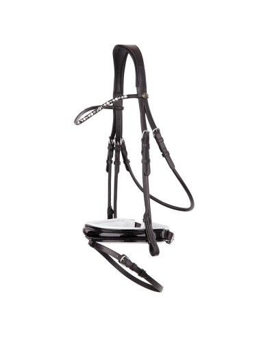 Symmetrische Trense mit anatomisch geformtem, weich gepolstertem Genickstück. Das schmale, leicht geschwungene Stirnband ist mit hochwertigen, österreichischen Kristallen in drei verschiedenen Farben versehen. Das extra breite (± 4.5 cm) schwedisch kombinierte Reithalfter mit Lackleder ist rund bombiert und weich gepolstert und hat ein breites, weiches Kinnpolster. Das Reithalfter ist außerdem anatomisch geformt. Die Trense hat eine V-förmige Befestigungsschlaufe für Sperriemen, Zaumhaken und eine Schutzklappe für die Schnalle des Sperriemens. Reithalfter, Kehlriemen und Backenstücke sind aus rundgenähtem Leder. Die Trense hat runde, glänzende, silberfarbige Schnallen. Lieferung ohne Zügel.