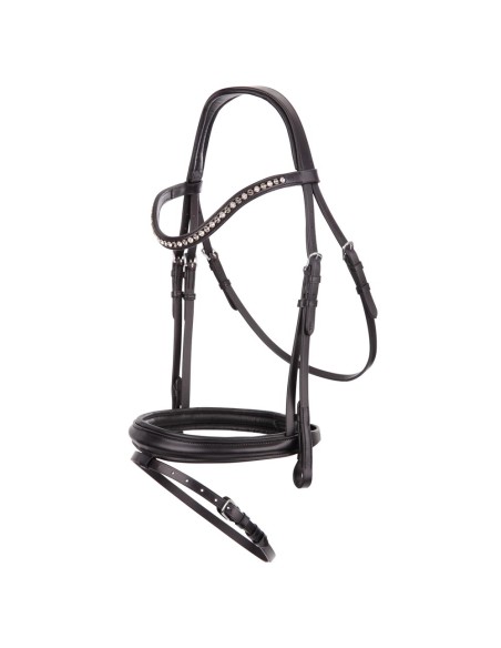 Symmetrische Trense mit anatomisch geformtem, weich gepolstertem Genickstück. Das leicht geschwungene Stirnband hat österreichischen Kristallen in zwei verschiedenen Farben und ist mit weichem Leder unterlegt. Das englisch kombinierte Reithalfter (± 4 cm) ist rund bombiert und weich gepolstert. Das Reithalfter ist außerdem anatomisch geformt. Die Trense hat eine V-förmige Befestigungsschlaufe für Sperriemen, Zaumhaken und eine Schutzklappe für die Schnalle des Sperriemens. Die Trense hat runde, glänzende, silberfarbige Schnallen. Lieferung ohne Zügel.