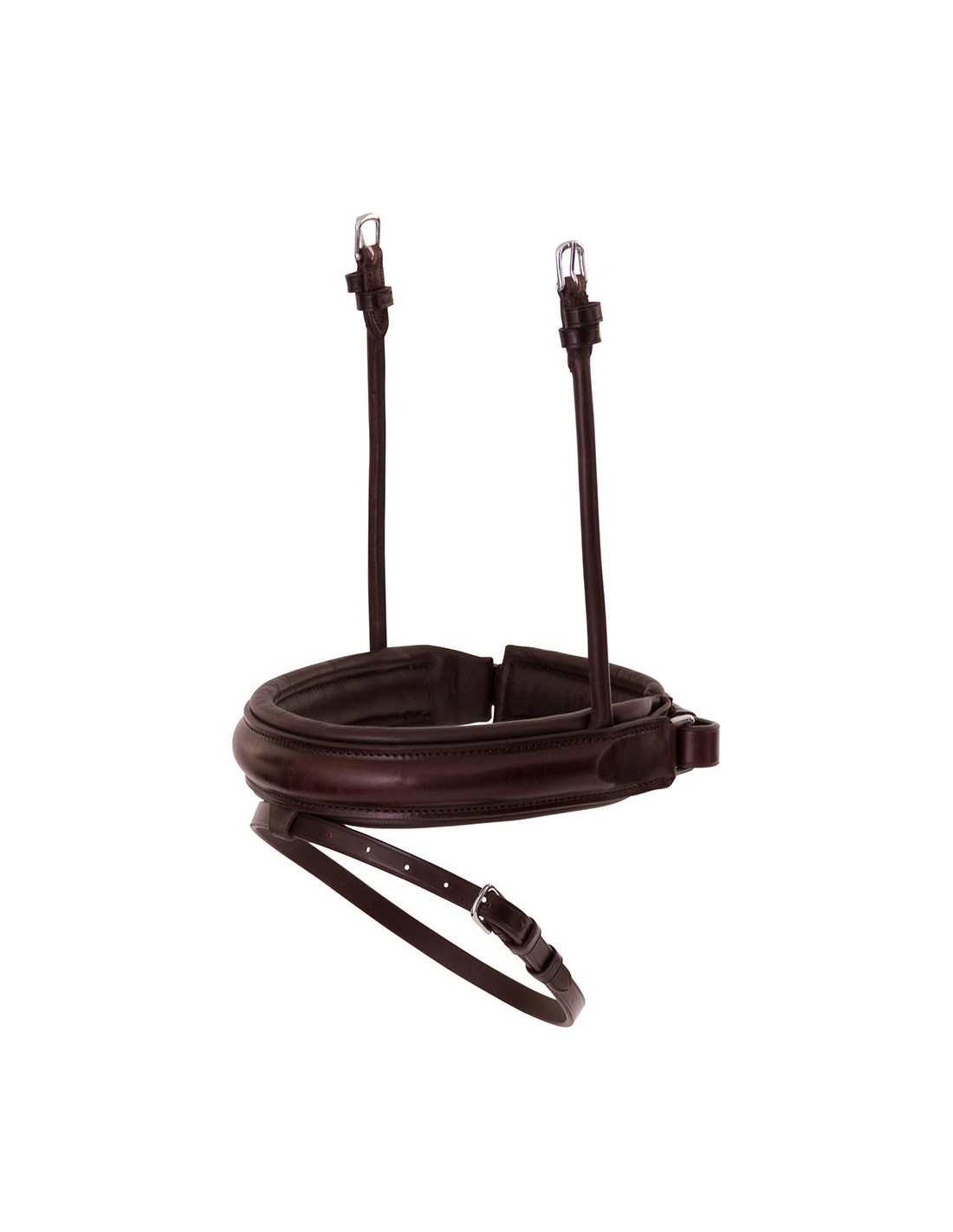 Das extra breite (± 5 cm) schwedisch kombinierte Reithalfter ist rund bombiert und weich gepolstert und hat ein breites, weiches Kinnpolster. Die Backenstücke sind aus rundgnähtem Leder. Das Reithalfter hat eine V-förmige Befestigungsschlaufe für Sperriemen und eine Schutzklappe für die Schnalle des Sperriemens. Eignet sich für Trensenzäume wobei die Gurte des Reithalfters mit einer Schnalle am Genickstück befestigt werden, wie die symmetrischen BR Trensenzäume. Mit glänzenden, silberfarbigen Schnallen.