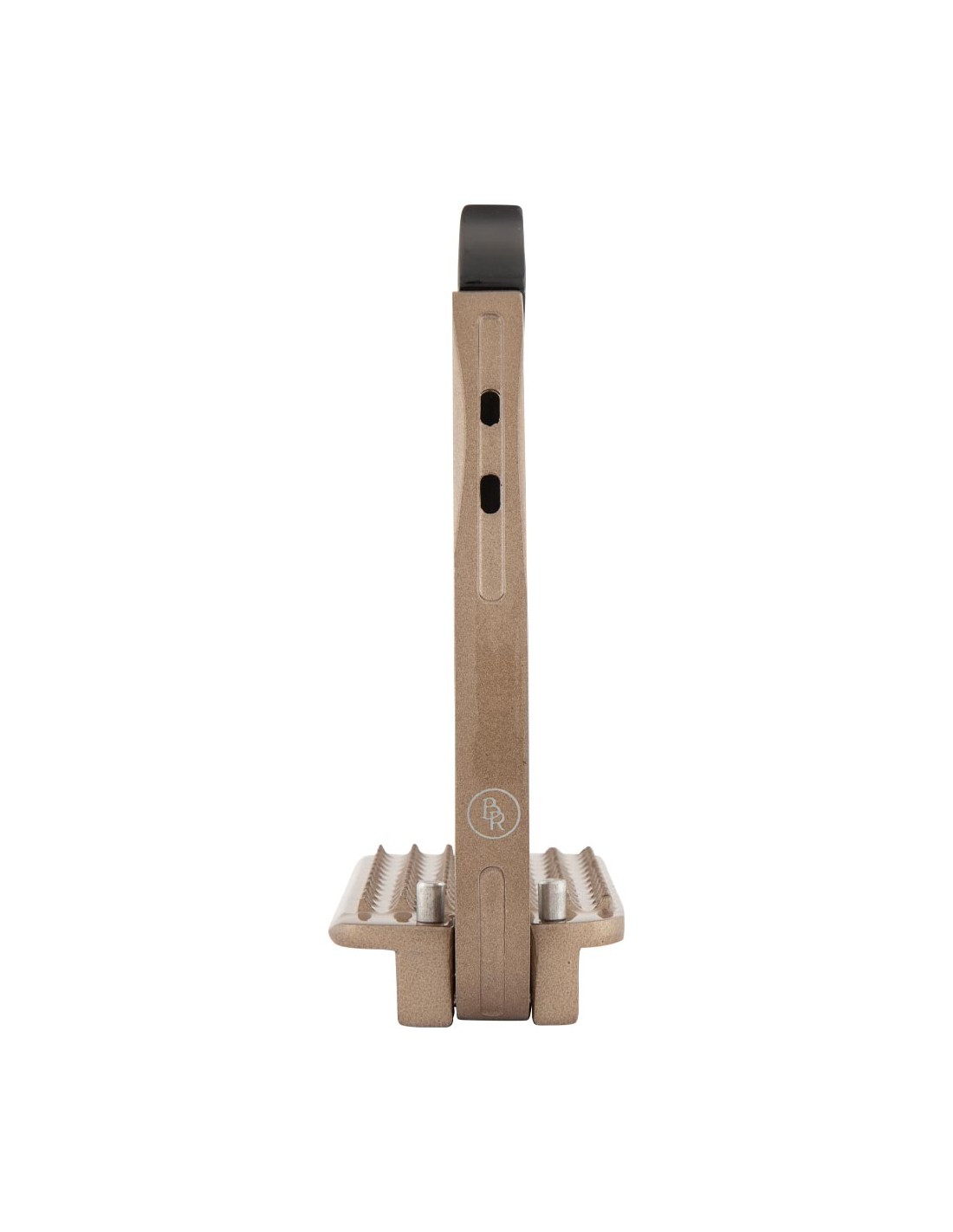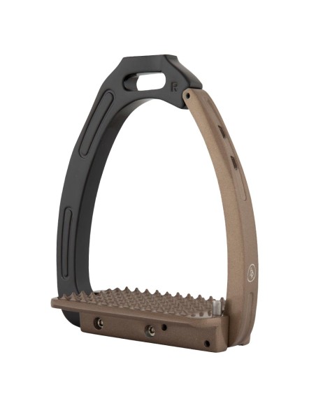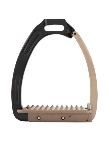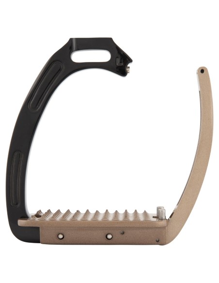 Dieser Steigbügel aus galvanisiertem Aluminium mit Pulverbeschichtung ist zur Verbesserung der Stabilität auf der Innenseite mit Edelstahl verstärkt. Der Bügel verfügt über einen magnetischen Sicherheitsmechanismus. Das Gewicht des Reiters sorgt dafür, dass sich der Bügel bei einem Sturz öffnet. So bleibt der Fuß nicht im Steigbügel hängen. Sobald der Fuß den Bügel verlassen hat, schließt sich der Bügel automatisch. Die leicht gebogene Steigbügelriemenaufhängung sorgt für eine gute Bügelposition, wodurch der Fuß in der richtigen Position gehalten wird. Dies bietet dem Reiter mehr Stabilität und verbessert die Beinhaltung.