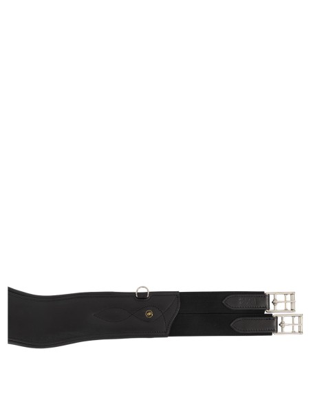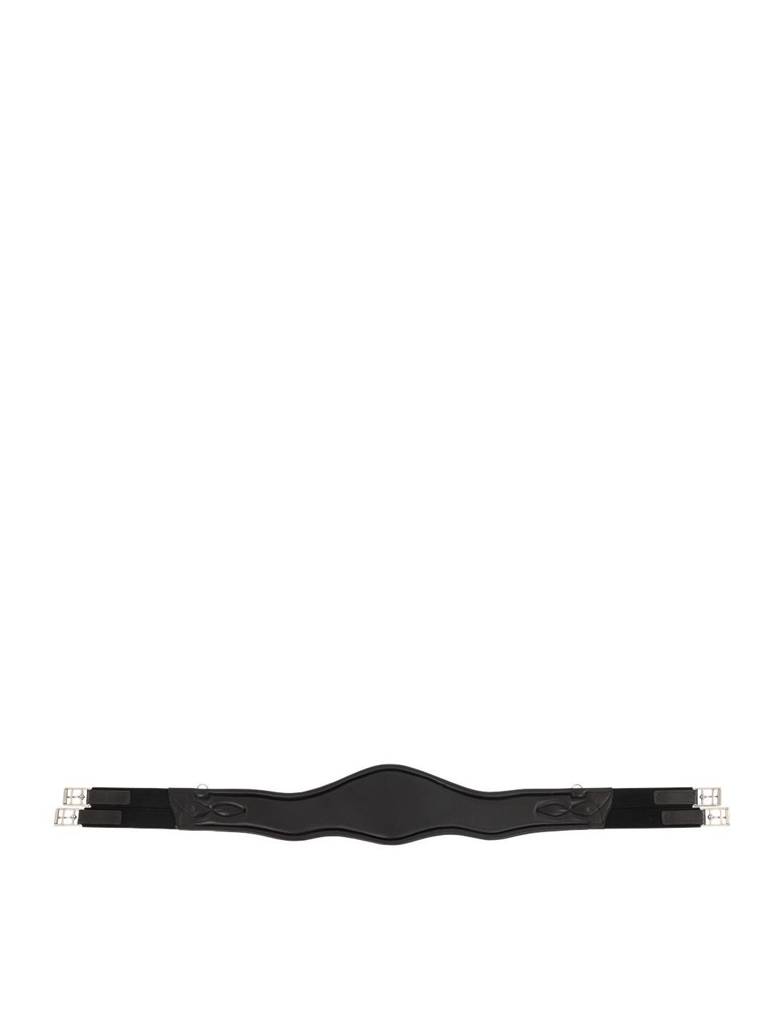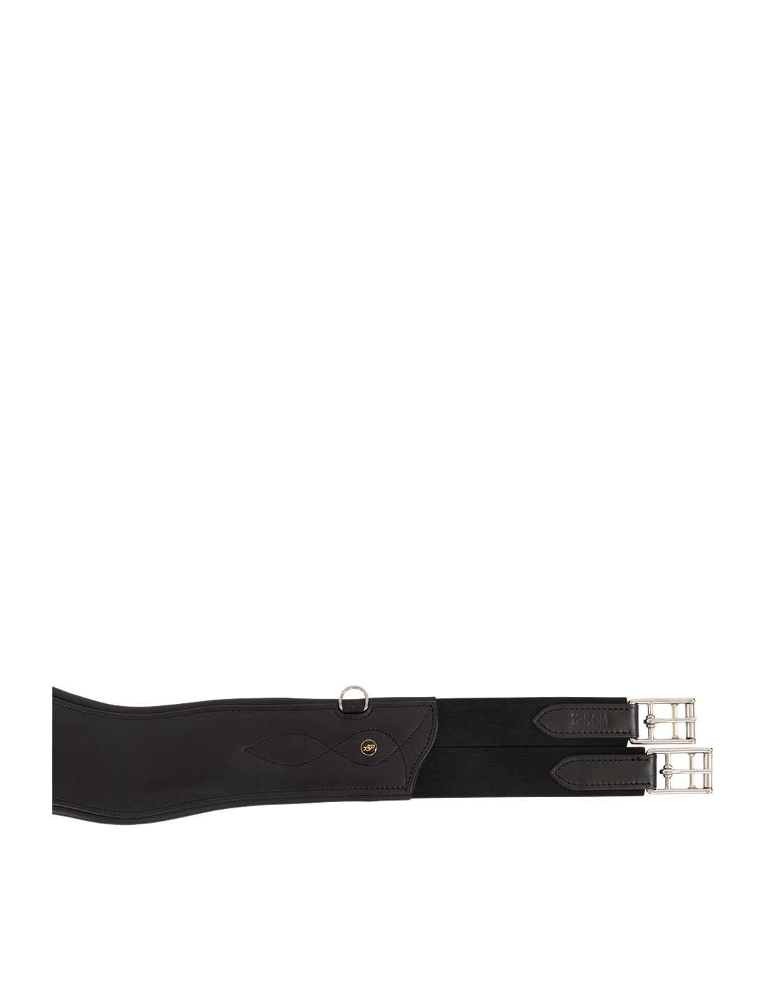 Das anatomische Design des Gurtes gibt dem Pferd optimale Bewegungsfreiheit. Der Gurt verfügt beidseitig über Elastikeinsätze und elegante Rollschnallen aus Edelstahl. Die elastischen Einsätze bieten zusätzlichen Komfort und erleichtern das Nachgurten. In der Mitte befindet sich ein Karabinerhaken und an den Seiten befinden sich zwei kleine D-Ringe zur Befestigung von Hilfszügeln. Die verspielten Ziernähte runden den Sattelgurt elegant ab.