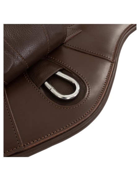 BR Sattelgurt Driffiel besteht aus hochwertigem Leder, das weich ist, sich angenehm anfühlt und lange hält. Auffällig an diesem Sattelgurt ist die Lasche, die den Karabinerhaken in der Mitte abdeckt. Diese Lasche schließt magnetisch.