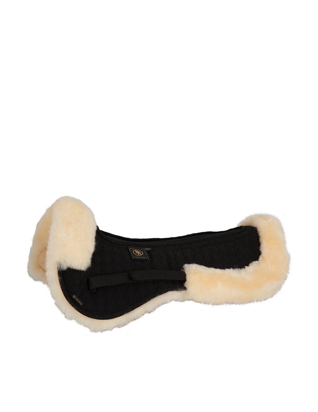 Baumwoll-Sattelunterlage mit Rand aus medizinisch gegerbtem Lammfell. Die Unterlage hat eine Aussparung für den Wirbelkanal aus Air Mesh. Dank dieser Air Mesh-Aussparung wird die Luftzirkulation verbessert und der Wirbelkanal bleibt kühler.
