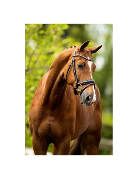 Dieser symmetrische Trensenzaum aus hochwertigem europäischem Leder hat ein E-Line-Genickstück. Dieses anatomisch geformte Genickstück ist weich gepolstert und bietet dank seiner runden Form zusätzliche Ohrenfreiheit. Das geschwungene Stirnband ist mit silberfarbenen, österreichischen Kristallen verziert und mit weichem Leder unterlegt. Der Kehlriemen ist beidseitig verstellbar. Sowohl der Kehlriemen als auch die Backenstücke sind aus rundgenähtem Leder gefertigt. Die Backenstücke sind mit Zaumhaken versehen. Die Trense hat ein breites, rundgenähtes schwedisch kombiniertes Reithalfter (ca. 4 cm). Das Reithalfter ist rund bombiert, weich gepolstert und mit einem breiten, weich gepolsterten Kinnschutz versehen. Dank der anatomischen Form gibt es mehr Platz für die Gebissringe. Die Trense hat eine V-förmige Sperrriemenschlaufe und die Schnalle des Sperrriemens verfügt über eine zusätzliche Schutzlasche. Die Trense ist mit glänzenden silberfarbenen Beschlägen aus verchromtem Messing ausgerüstet. Ohne Zügel.