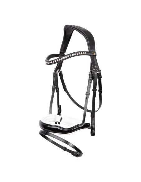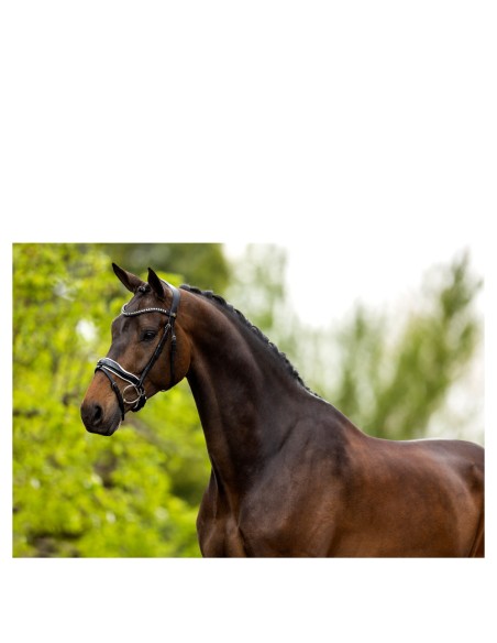Die Edle Akzenten sind auf dem leicht gebogenen Stirnband und auf dem Nasenriemen zu finden. Das Stirnband enthält strahlende, helle, Stellux™ Kristalle und das kombinierte Reithalfter umfasst Lackleder. Der Trensenzaum ist mit glänzenden, silberfarbenen Beschlägen aus verchromtem Messing ausgerüstet.