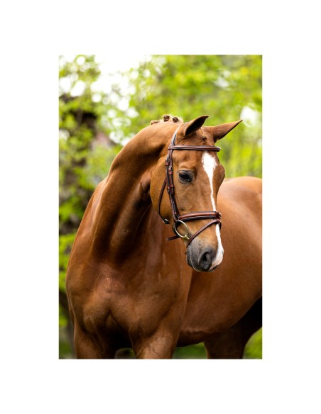 Dieser symmetrische Trensenzaum aus hochwertigem europäischem Leder hat ein E-Line-Genickstück. Dieses anatomisch geformte Genickstück ist weich gepolstert und bietet dank seiner runden Form zusätzliche Ohrenfreiheit. Das gerade Stirnband ist rund bombiert, weich gepolstert und mit Kontraststickereien verziert. Der Kehlriemen lässt sich mithilfe der Schnalle auf der Unterseite verstellen. Die Schnalle verfügt über eine zusätzliche Schutzlasche. Die Backenstücke sind mit Zaumhaken versehen. Die Trense hat ein englisch kombiniertes Reithalfter (ca. 2,7 cm), das mit Kontraststickereien verziert ist. Dieses Reithalfter ist rund bombiert und weich gepolstert. Sowohl der Sperrriemen als auch die Sperrriemenschlaufe sind abnehmbar. So kann die Trense einfach in ein Modell mit einfachem Nasenriemen geändert werden. Die Schnalle des Sperrriemens hat eine zusätzliche Schutzlasche. Die Trense ist mit glänzenden silberfarbenen Beschlägen aus verchromtem Messing ausgerüstet. Ohne Zügel.