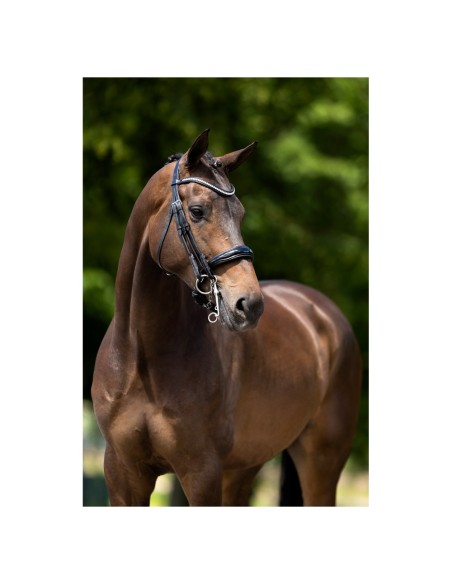 Dieser symmetrische Kandarenzaum aus hochwertigem europäischem Leder hat ein E-Line-Genickstück. Dieses anatomisch geformte Genickstück ist weich gepolstert und bietet dank seiner runden Form zusätzliche Ohrenfreiheit. Das geschwungene Stirnband ist mit silberfarbenen, österreichischen Kristallen verziert und mit weichem Leder unterlegt. Der Kehlriemen lässt sich mithilfe der Schnalle auf der Unterseite verstellen. Die Schnalle verfügt über eine zusätzliche Schutzlasche. Die Backenstücke sind aus rundgenähtem Leder gefertigt und mit Zaumhaken ausgeführt. Die Kandare hat ein breites schwedisches Reithalfter (ca. 4 cm) in Lacklederausführung mit rundgenähten Riemen. Das Reithalfter ist rund bombiert, weich gepolstert und mit einem breiten, weich gepolsterten Kinnschutz versehen. Dank der anatomischen Form gibt es mehr Platz für die Gebissringe. Die Kandare ist mit glänzenden silberfarbenen Beschlägen aus verchromtem Messing ausgerüstet. Ohne Zügel.