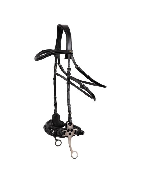 Das E-Line Anatomic Genickstück (art.189058) ist anatomisch geformt und weich gepolstert. Der runde E-Schnitt bietet zusätzliche Freiheit hinter den Ohren des Pferdes. Der Hackamore enthält Anzüge und hat deshalb eine Hebelwirkung. Beim Anziehen der Zügel, wird es zum Drück auf der Nase und auf dem Kinn kommen und wird es ein bisschen Druck auf dem Nacken und den Ohren geben. Der extra weiche Padding beim Nasenriemen sorgt dafür das den Druck gelindert wird. Außerdem gibt es ein weiches Kinnpolster und Schutzlasche unter den Seiten des Stirnbandes.