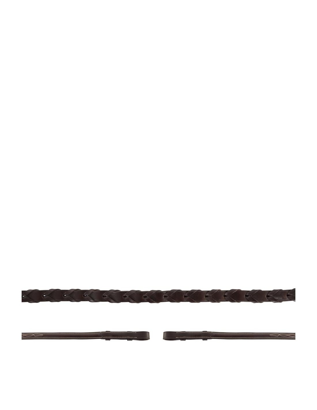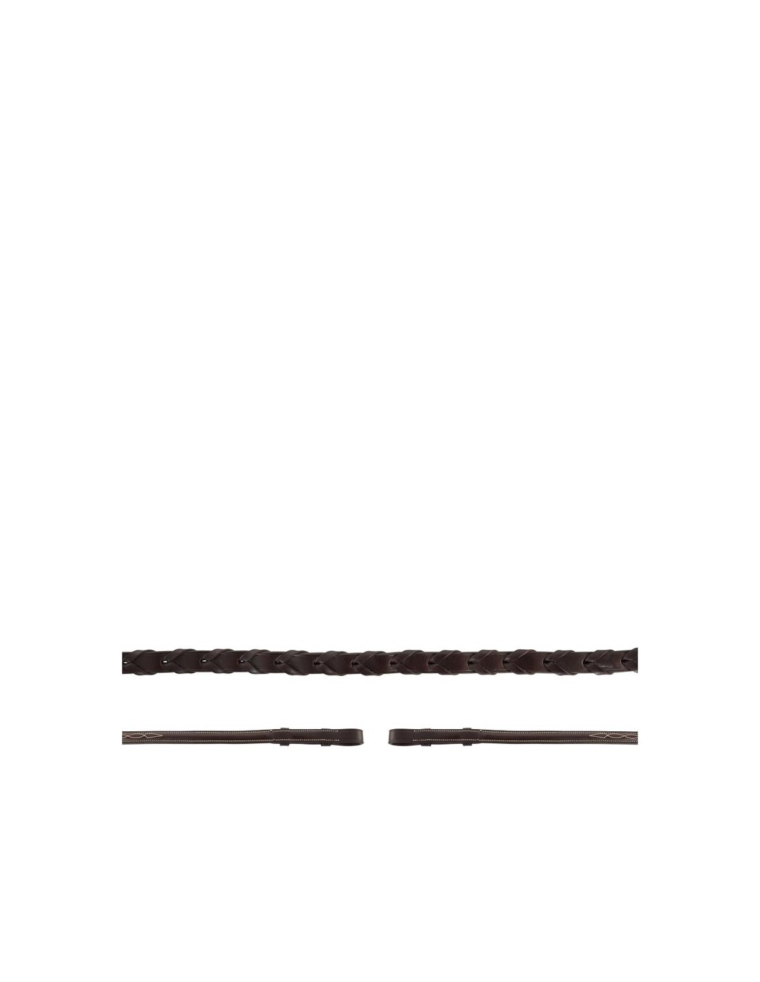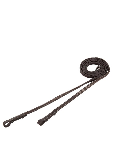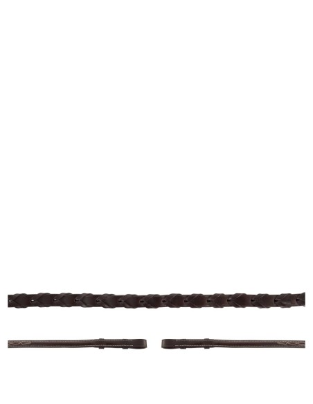 Diese geflochtenen Lederzügel eignen sich besonders für Hunter. Die Zügelenden sind rund bombiert und mit cremefarbenen Zierstickereien verziert. Mit Zaumhaken, ohne Martingalschieber. Diese Zügel sind 16 mm breit. Passend zur BR Huntertrense Oxford, Artikel 185000.