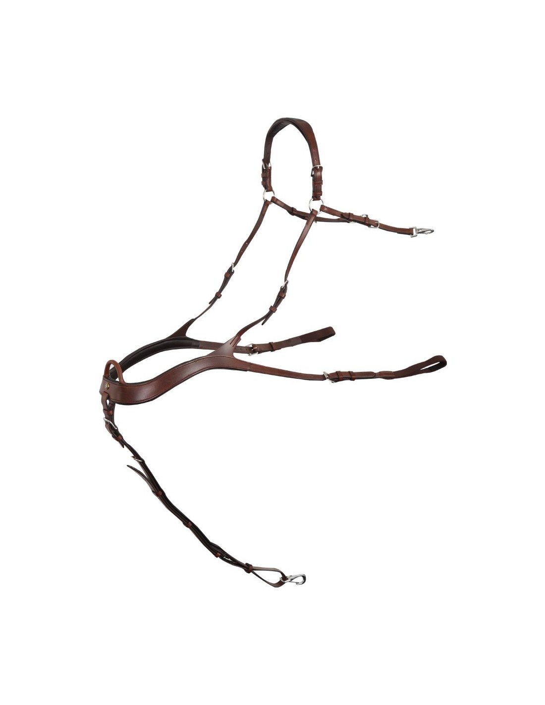 Dieses Fünf-Punkt-Vorderzeug besteht aus hochwertigem europäischem Leder und einem dauerhaften Elastikeinsatz. Das Vorderzeug hat eine abnehmbare und verstellbare Gurtschlaufe mit einem abnehmbaren Karabinerhaken zur Befestigung am Gurt. Das Vorderzeug wird mithilfe verstellbarer Lederriemen mit Schnallen an den Gurtstrippen befestigt, die Gurtbefestigungen sind aus elastischem Material. Zudem verfügt das Vorderzeug über verstellbare Lederriemen mit Karabinerhaken zur Befestigung an den D-Ringen auf der Vorderseite des Sattels. Die meisten Teile des Vorderzeugs sind weich gepolstert. Das Vorderzeug ist mit glänzenden silberfarbenen Beschlägen aus verchromtem Messing ausgerüstet. Das Vorderzeug verhindert, dass der Sattel nach hinten rutscht. Dies kann insbesondere beim Springen/Vielseitigkeitsreiten oder bei sehr runden Pferden, bei denen der Sattel schnell rutscht, nützlich sein. Das Vorderzeug wird ohne Gabel geliefert. Passend zur BR Martingalgabel, Artikel 239021, 239010 und 239012.
