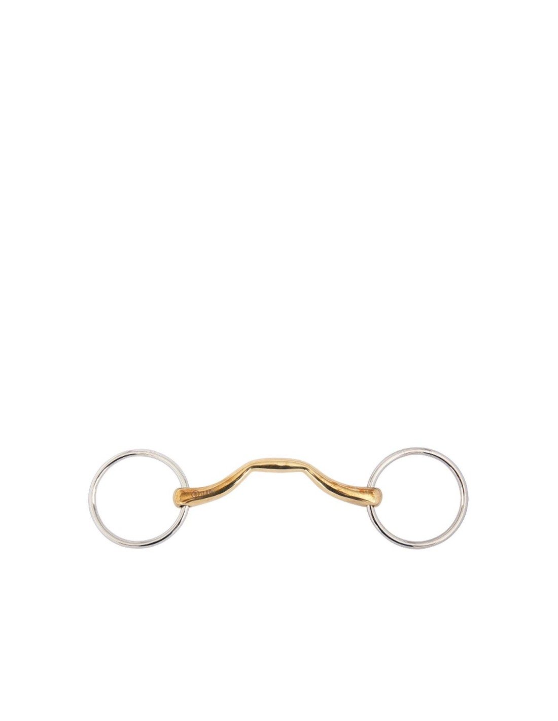 Diese ungebrochene Wassertrense ist aus massivem Cuprigan mit Edelstahlringen gefertigt. Cuprigan ist eine Legierung aus 89% Kupfer, 7% Aluminium, 3% Eisen und 1% Zink. Der Oxidationsprozess des Materials ergibt einen angenehmen Geruch und Geschmack. Die anatomische Form folgt der Form des Pferdemauls, was eine sanfte und gleichmäßige Druckverteilung ermöglicht. Die gebogene Form des Mundstücks ermöglicht ein bisschen mehr Raum für die Seitenpartien der Zunge. Die Kombination aus der Form und der einzigartigen Zusammensetzung von Cuprigan regt den Kauprozess und die Speichelbildung an, wodurch eine angenehme Verbindung mit dem empfindlichen Pferdemaul entstehen kann. Das Gebiss hat eine weiche Wirkung auf das Maul. Das Mundstück ist 14 mm stark und die ovalen Gebissringe haben einen Durchmesser von 65 mm.
