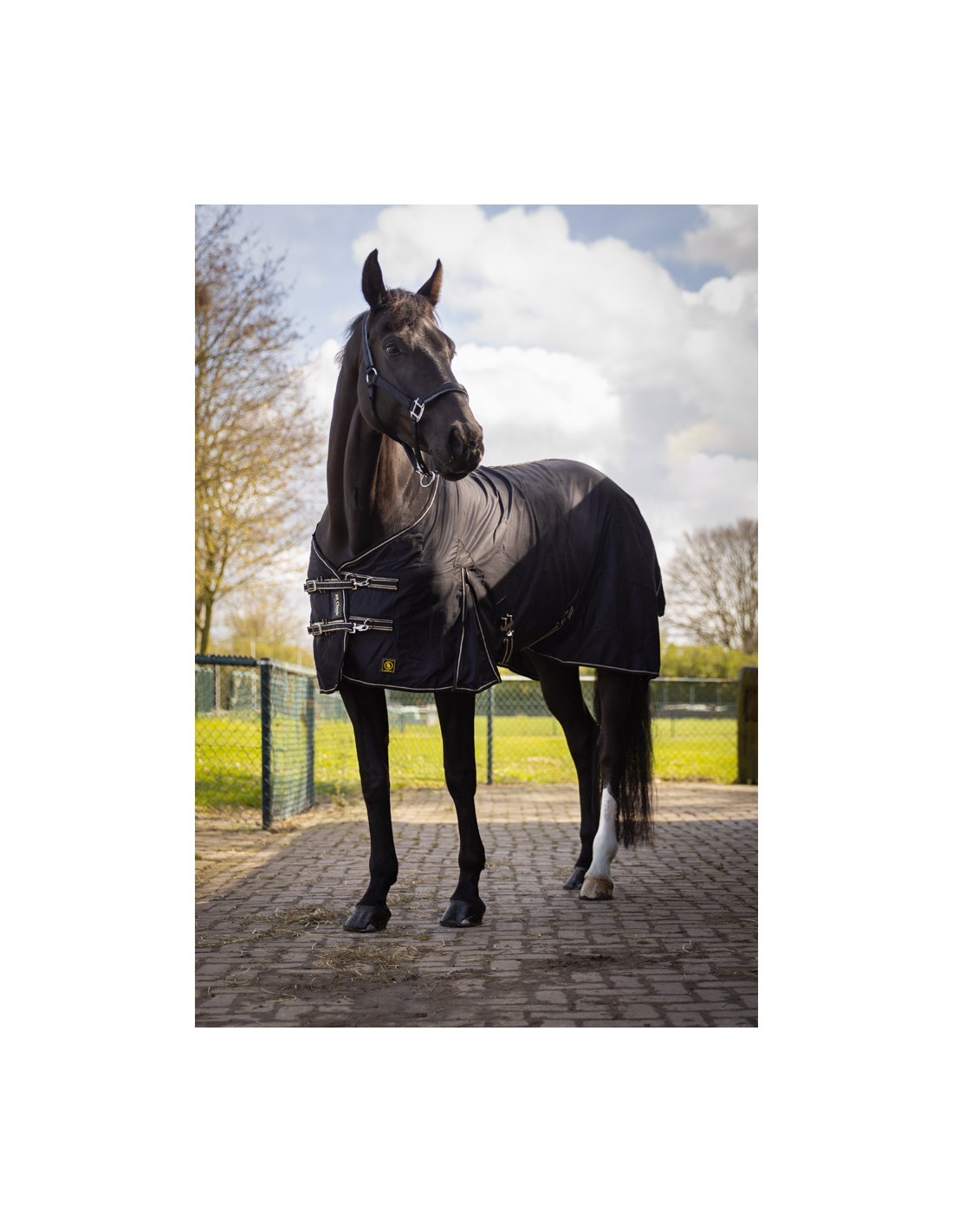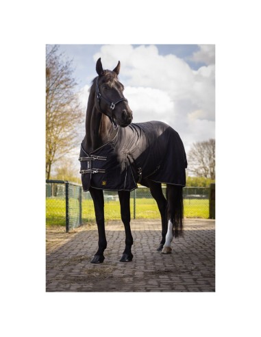 Diese anatomisch geformte Decke ist aus robustem Baumwollmischgewebe (65% Baumwolle, 35% Polyester) gefertigt. An der Brust ist die Decke mit einer zusätzlichen Baumwollmischgewebeschicht verstärkt. Die Decke verfügt über einen verstellbaren, doppelten Brustverschluss mit Schnellverschluss und Klettband. Darüber hinaus hat die Decke eine doppelt gestickte Rückennaht mit einer Paspel und ein Widerristpolster aus Fleece. Der Bauchgurt ist dank des PU-Kunstleder-Patches verstärkt. Weiter ist die Decke mit Gehfalten, Kreuzgurten mit Elastikeinsatz, die sowohl verstellbar als auch abnehmbar sind, und verstellbaren, abnehmbaren, elastischen Beinschnüren versehen. Die Decke ist mit Beschlägen aus Zink mit einer matten silberfarbenen Beschichtung ausgerüstet. Maschinenwaschbar bei 30°C.
