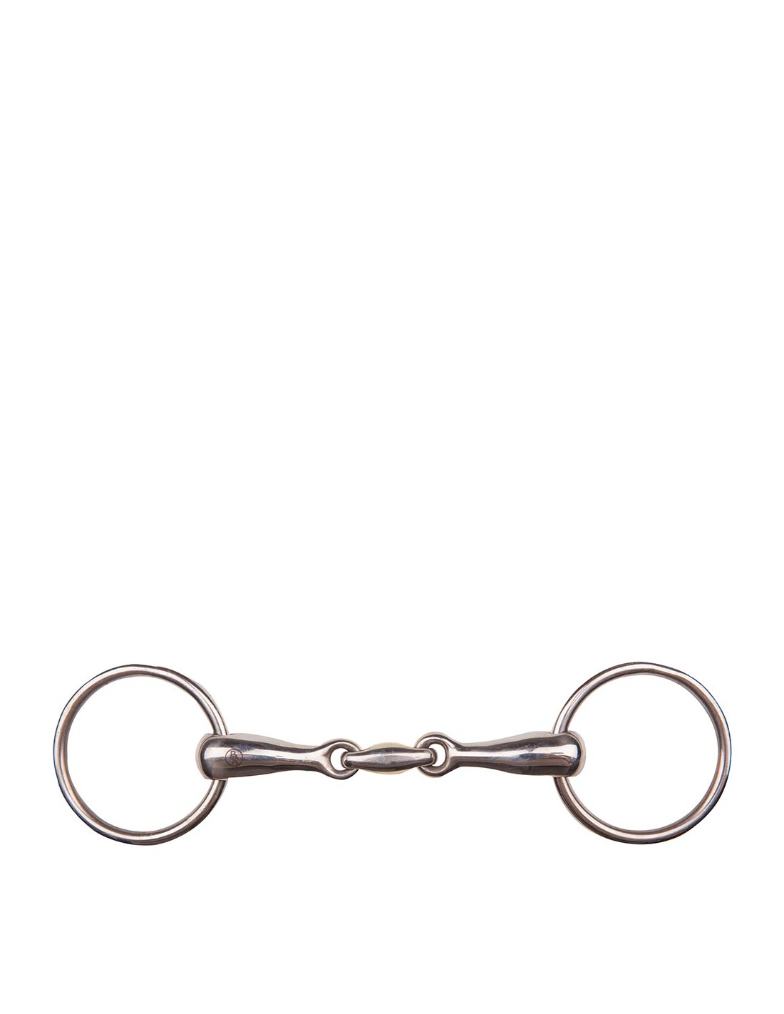 Doppelt gebrochen, massiv, Edelstahl. Durchmesser des Gebißrings bei 11.5 cm ist 55 mm, bei den anderen Größen 65 mm. Gebissdicke von 18 mm.