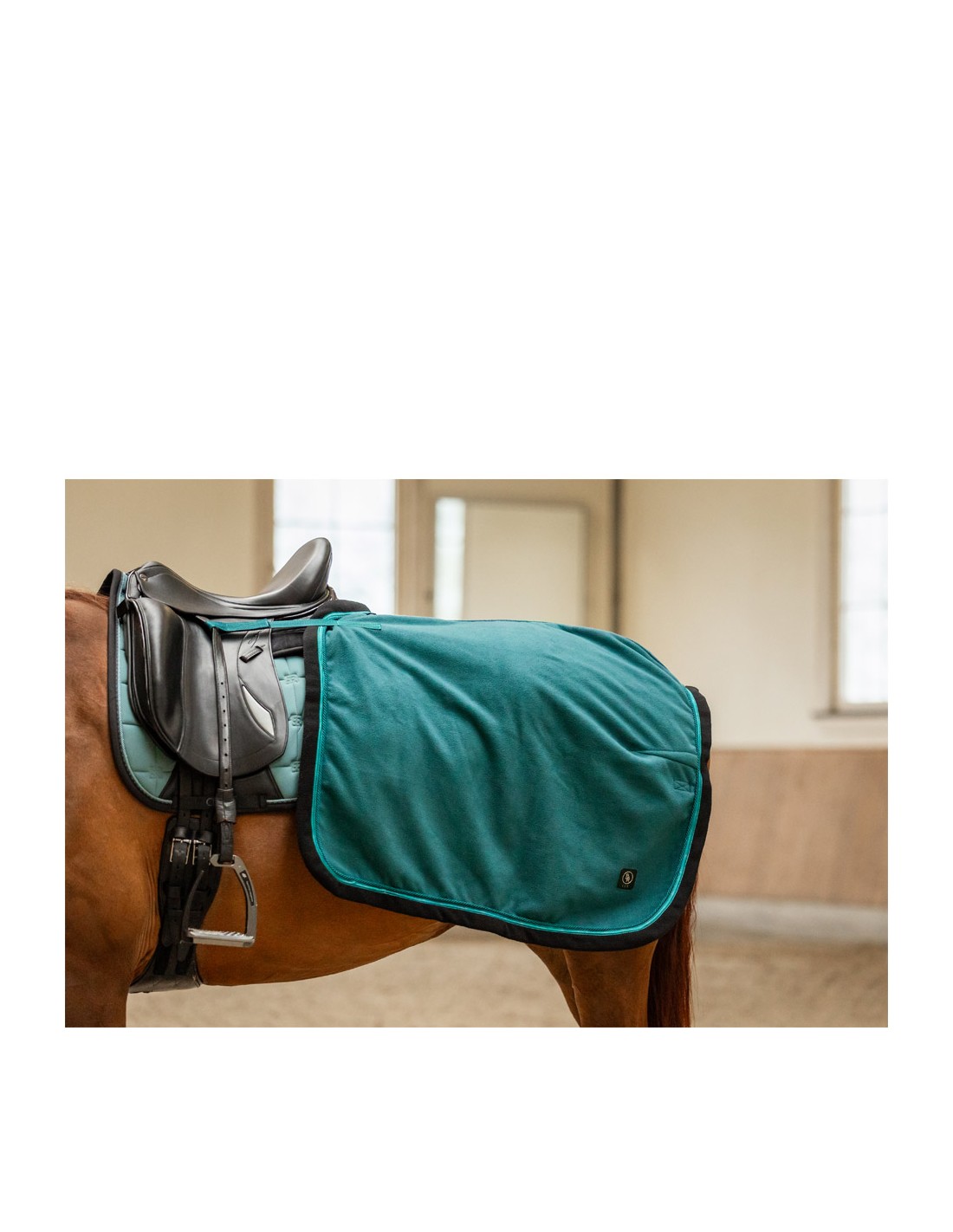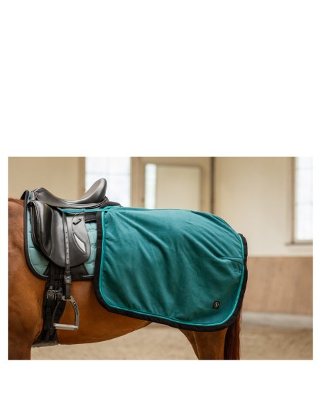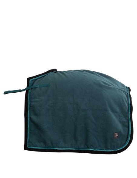 Die Ausreitdecke hat eine doppelt genähte Rückennaht und ist dort geformt, wo die Rückseite des Sattels platziert ist. Die Decke bleibt dank der starken Sattelschlaufen mit Klettverschluss, die die Decke am Sattel befestigen und der Schweifkordel fest auf dem Rücken des Pferdes. Der Schweifkordel hat eine praktische Kunststoffabdeckung, damit es leicht zu reinigen ist. Die Decke ist mit einem schönen Kordelbesatz und einem Markenbesatz mit CLX versehen.