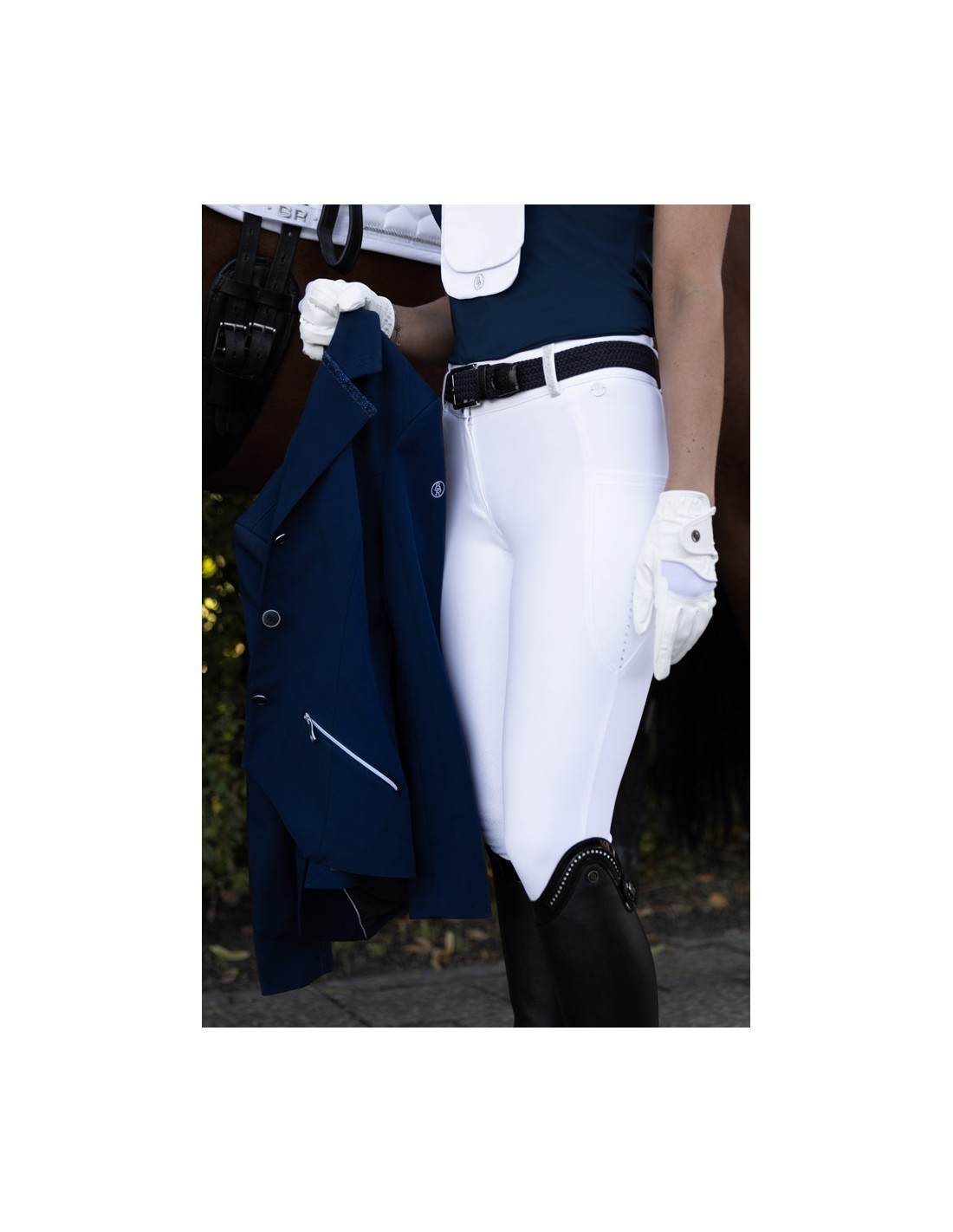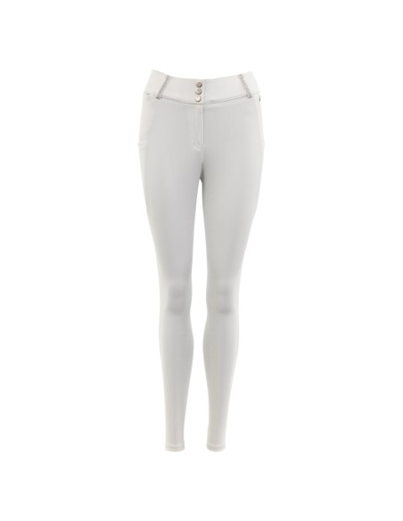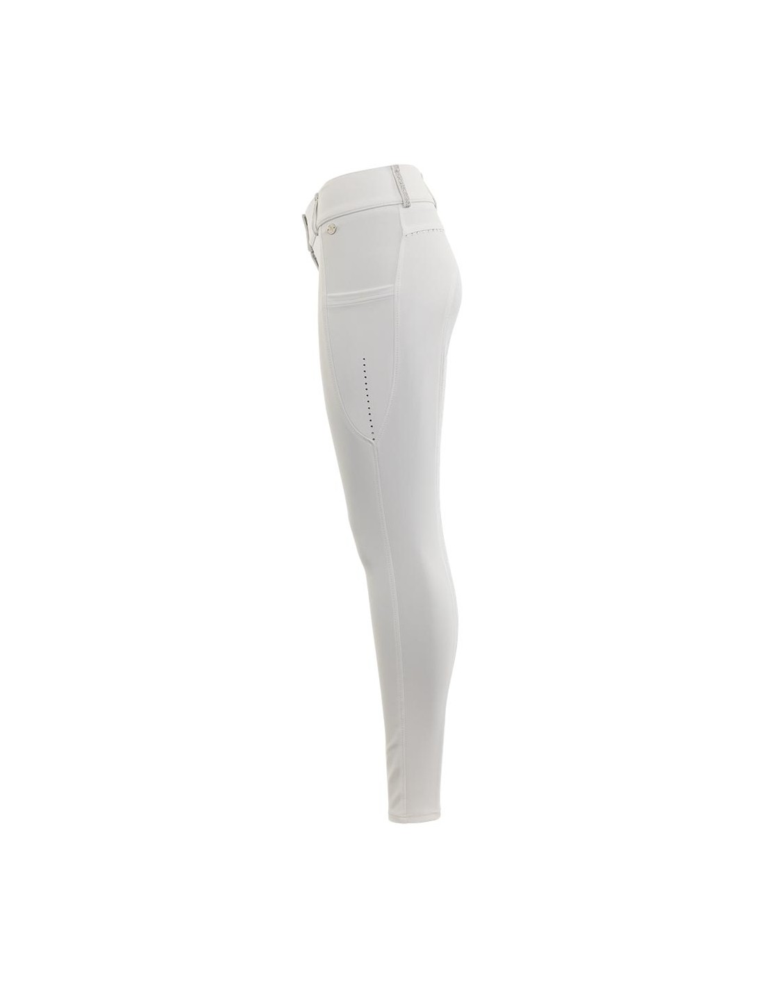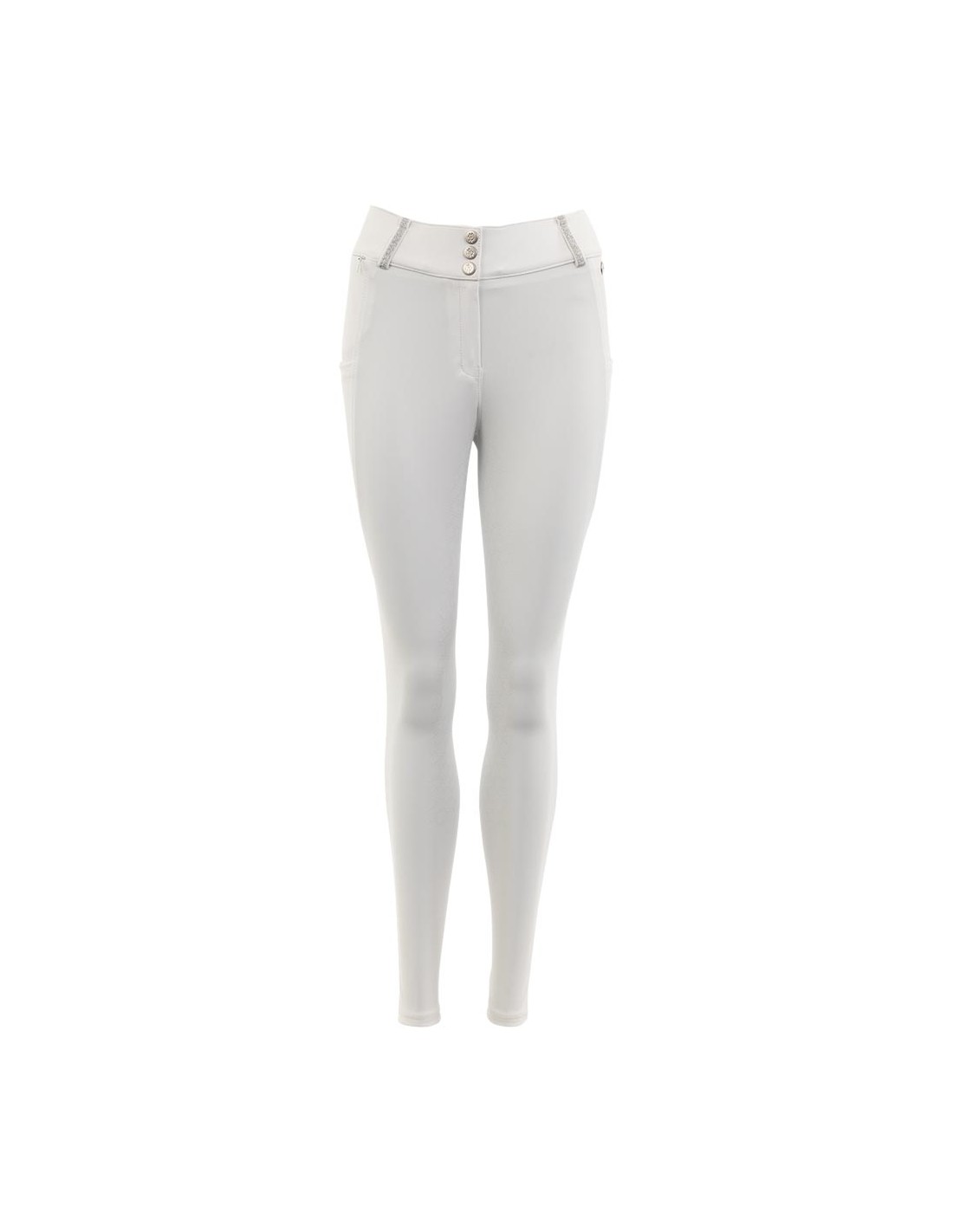 Reithose Cancun hat einen hohen Bund mit drei Haken- und Augenverschlüssen und silbernen Glitzerbändern an den Gürtelschlaufen. Die Hose ist mit zwei tiefen Seitentaschen ausgestattet, die zum Verstauen eines Mobiltelefons geeignet sind, und einer versteckten Reißverschlusstasche auf der rechten Vorderseite. Der Silikonsitz maximiert die Stabilität auf dem Sattel. Das elegante Finish mit Diamantenimitaten auf der Vorder- und Rückseite verleiht der Hose einen luxuriösen Look.