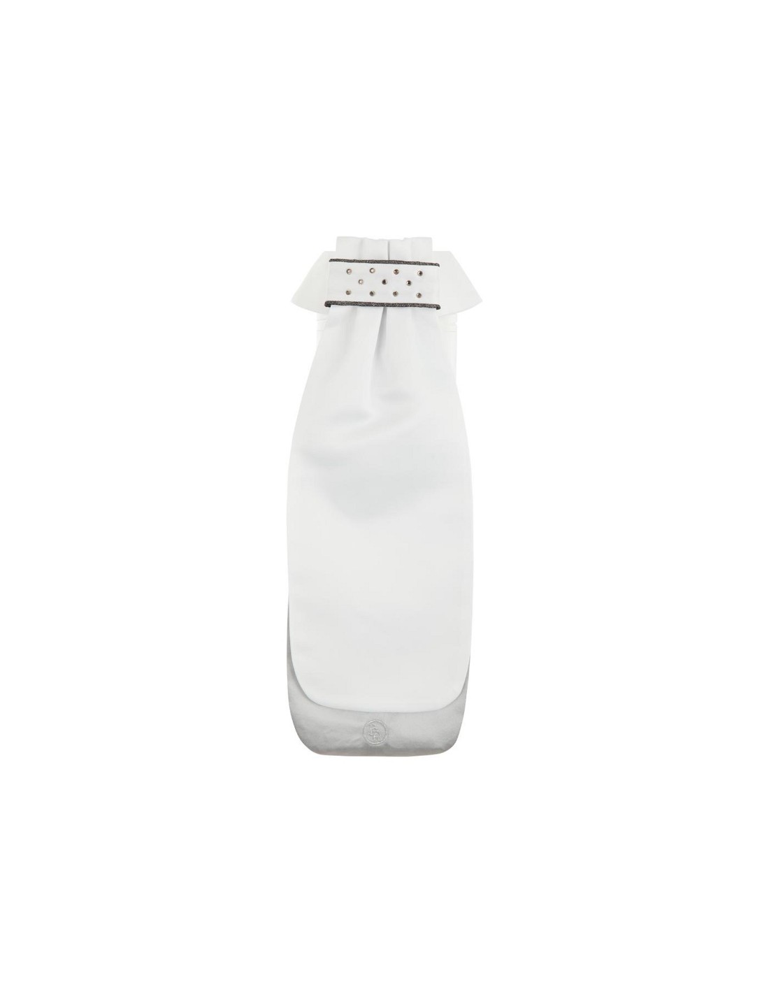 Gefaltetes Plastron aus qualitativ hochwertigem glänzendem Polyester-Satin. Das Band des Plastrons ist in der Mitte mit dunklem Strass und einer glitzernden Paspel verziert. Das Plastron ist auf der Unterseite mit einem silberfarbenen gestickten BR-Logo versehen. Es hat einen doppelten Aufschlag, die Innenseite ist für ein besonders elegantes Aussehen in glänzendem silberfarbenem Satin ausgeführt. Das Plastron ist äußerst praktisch im Gebrauch, muss nicht gefaltet werden und auch die Verwendung einer Plastronnadel ist nicht notwendig. Das Plastron lässt sich mit dem Klettverschluss hinten einfach am Kragen des Turniershirts oder der Turnierbluse befestigen.