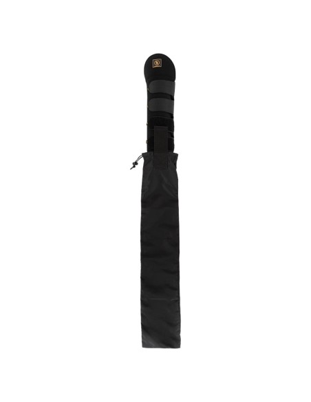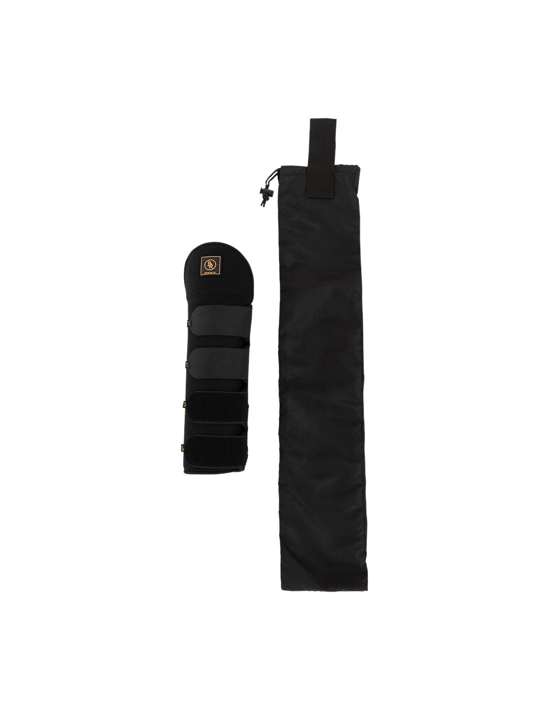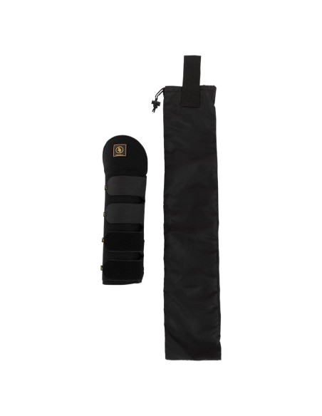 Der Schweifschoner ist auf der Innenseite mit 3-lagigem, rutschfestem Gummi ausgekleidet, damit der Protektor am Schweif an Ort und Stelle bleibt. Der obere Teil ist für zusätzlichen Schutz mit 3-Lagen-Schaum verdickt (7 mm davon 5 mm Hartschaum). Der Schoner wird mittels 3 Klettverschlüssen befestigt und der Beutel kann per Klettverschluss am Schoner befestigt werden.