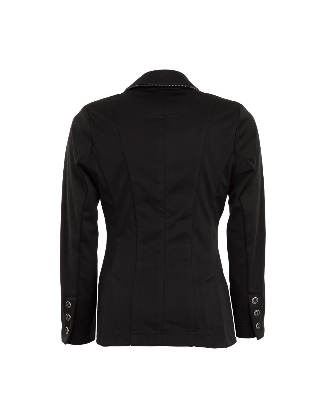Turniersakko mit tailliertem Schnitt aus 100 % Polyester-Softshell. Dieses bequeme Material ist wasserabweisend, dehnbar und leicht. Auf der Vorderseite verfügt der Sakko über drei BR-Knöpfe aus Kunststoff. Die Manschetten sind mit den gleichen Knöpfen in einem kleineren Format versehen. Sowohl auf den Klappentaschen als auch auf dem Kragen befindet sich eine Zierkordel mit einem subtilen silberfarbenen Detail. Auffallend an dem Sakko ist der elegante Schnitt auf der Rückseite, der die Taille besonders betont. Die Ärmel haben eine bequeme Passform. Der Sakko verfügt über zwei Reitschlitze auf der Rückseite. Maschinenwaschbar bei 30 °C