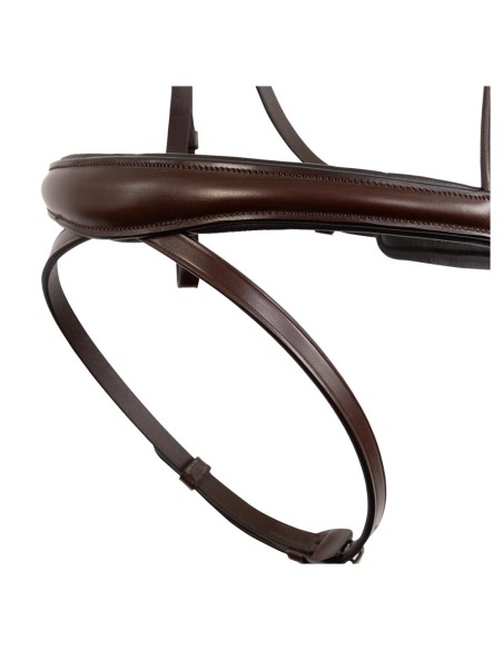 Eine Besonderheit dieses Trensenzaumes ist der Sperriemen, der teilweise in der Vorderseite des Nasenriemens versteckt ist. Zusammen mit dem geraden Stirnband macht dies den Trensenzaum stilvoll und klassisch. Dieser wunderbar weiche und flexible Trensenzaum ist außerdem mit einem Schnallenschutz am Sperriemen und einem Kinnschutz ausgestattet.