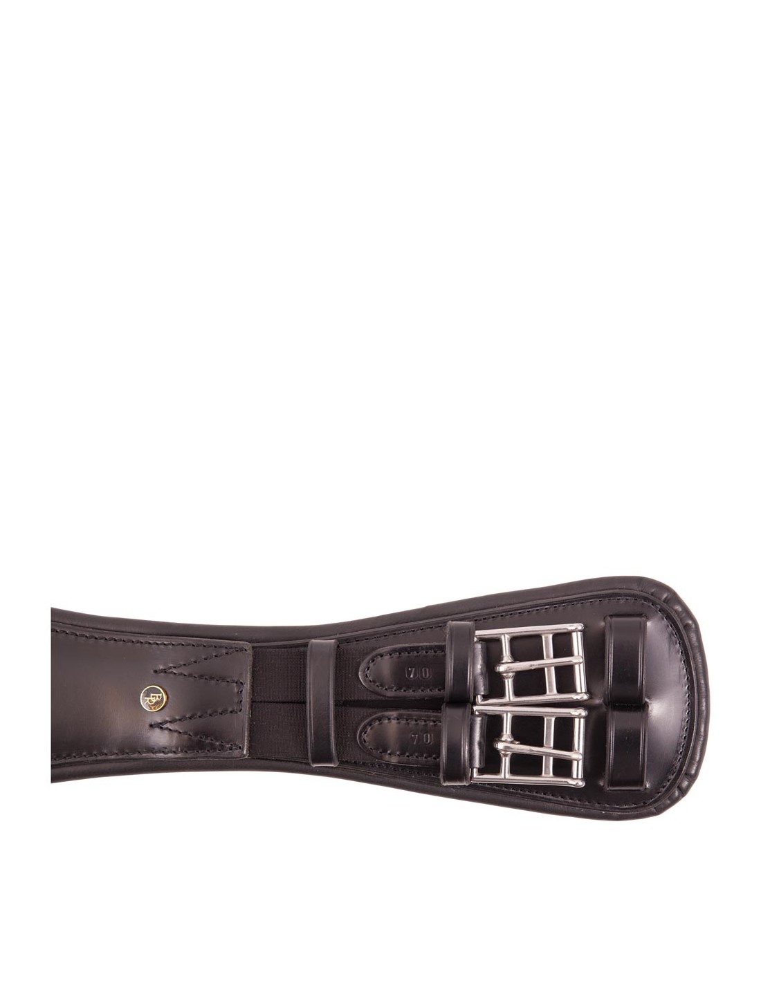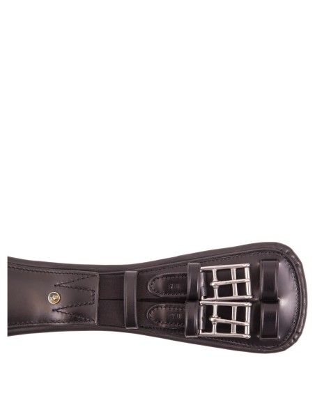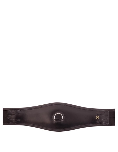 Anatomisch geformter Dressurgurt aus Leder. Der Gurt hat elastische Enden und einen D-Ring für die Befestigung von eventuellen Hilfszügel. Der Gurt ist ausgestattet mit Edelstahl-Rollschnallen und Ziernähten.