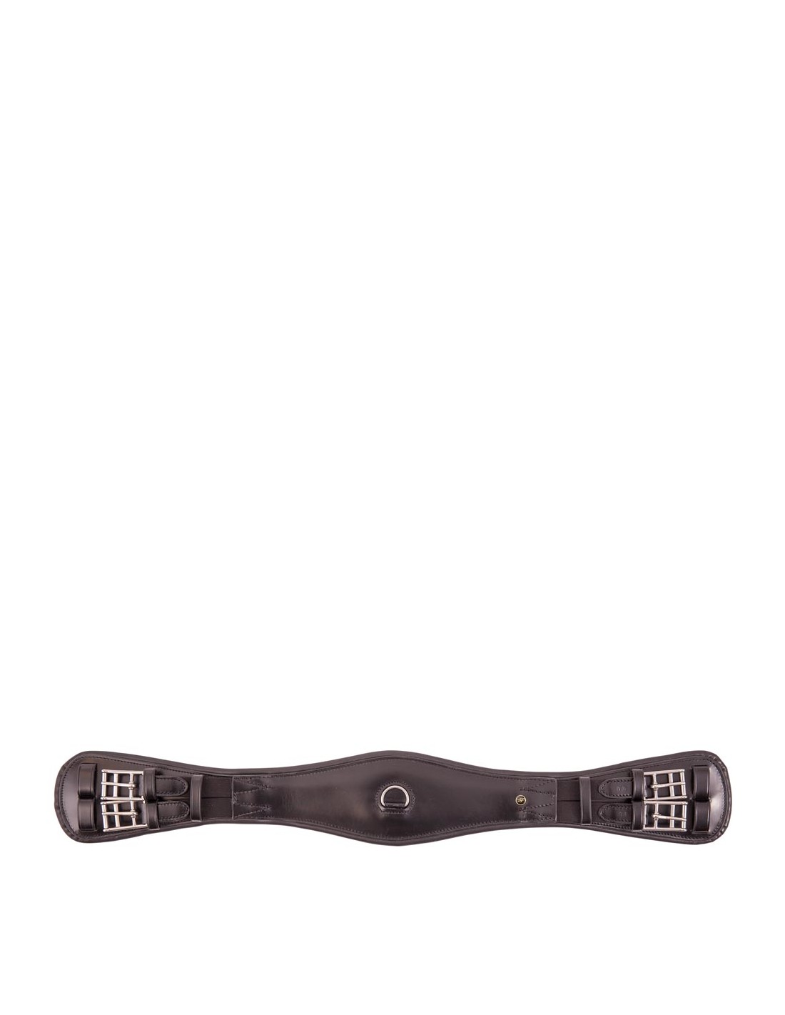 Anatomisch geformter Dressurgurt aus Leder. Der Gurt hat elastische Enden und einen D-Ring für die Befestigung von eventuellen Hilfszügel. Der Gurt ist ausgestattet mit Edelstahl-Rollschnallen und Ziernähten.