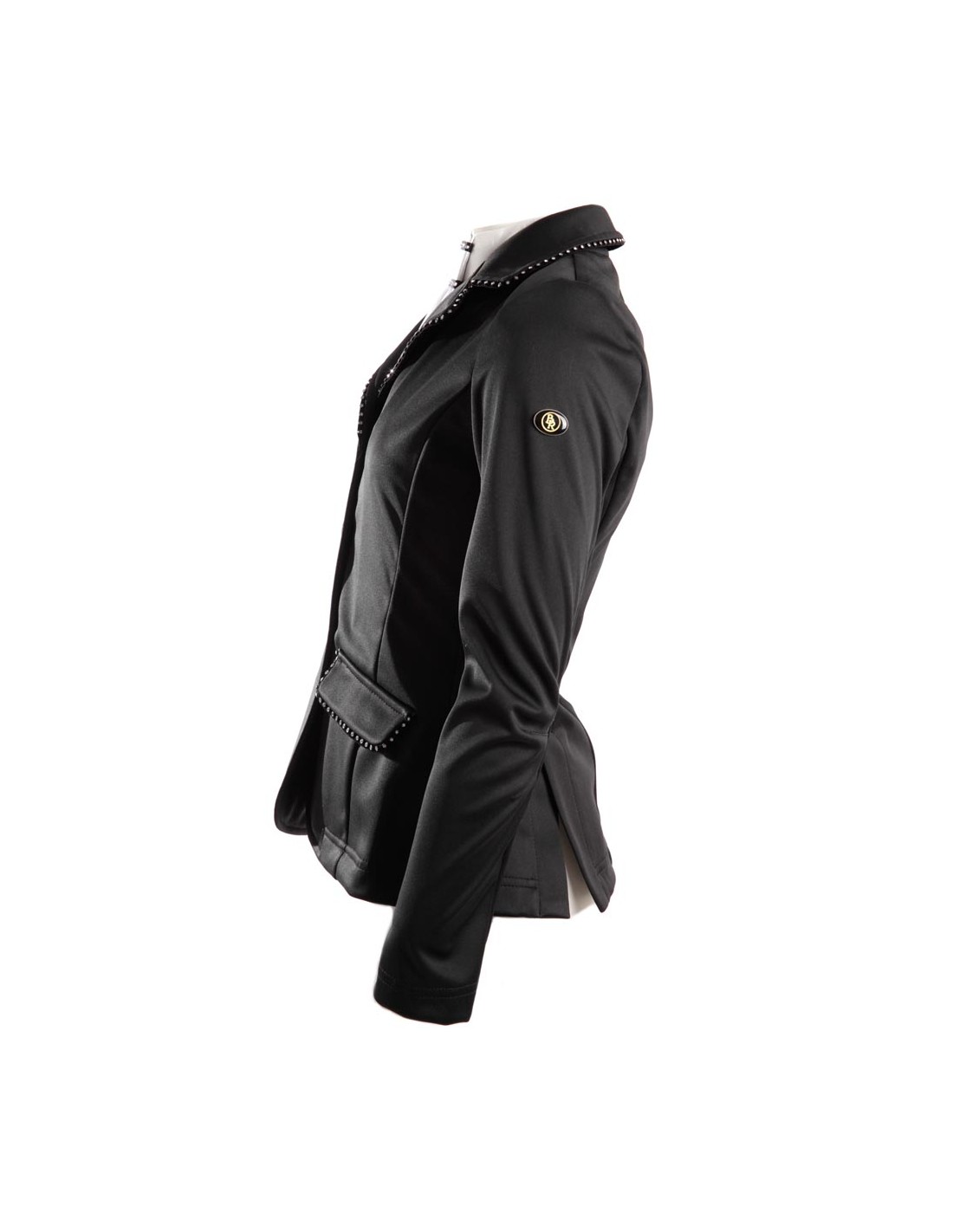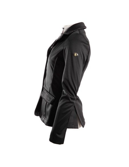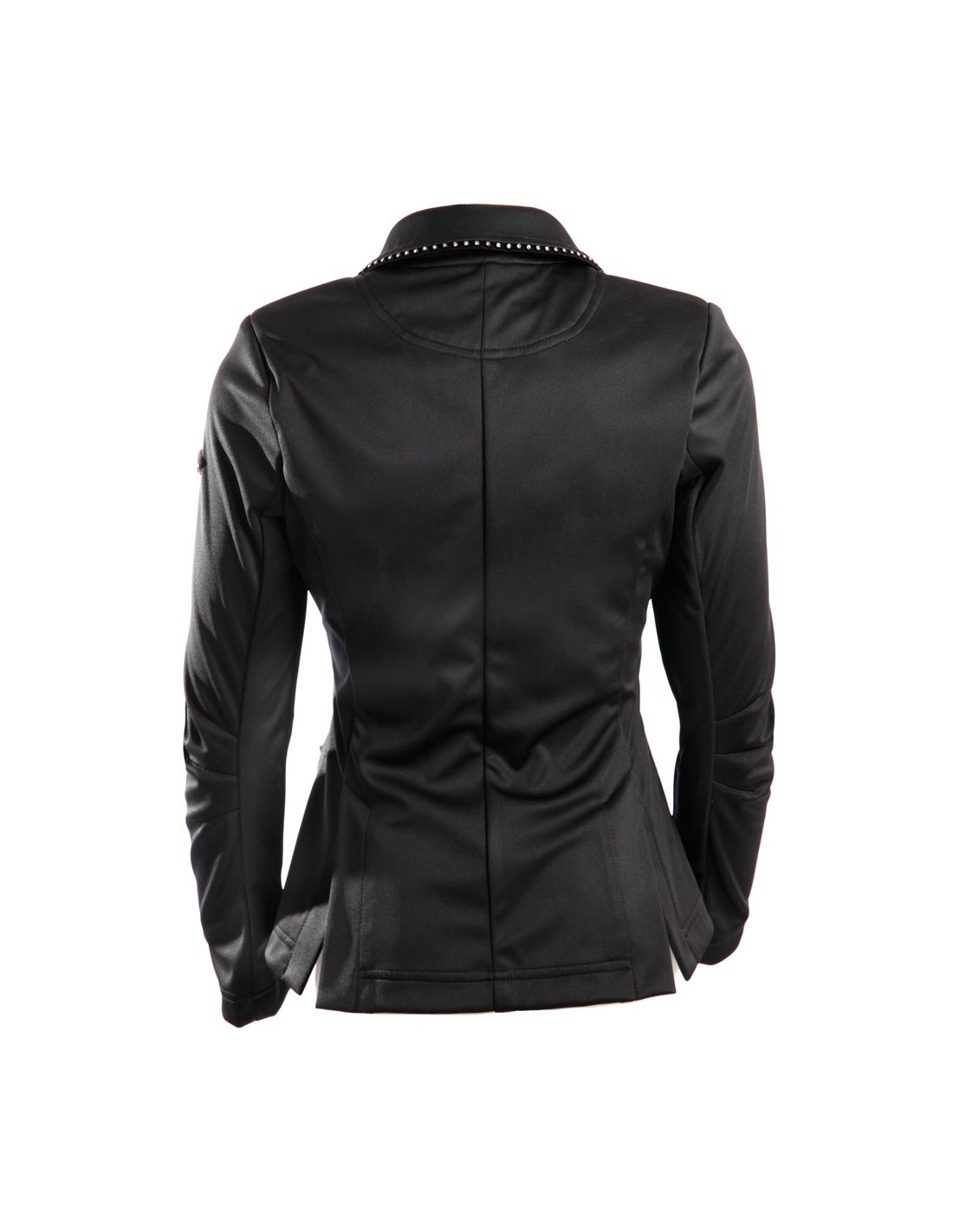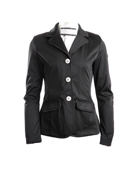 Stylisch geschnittenes Turniersakko mit doppelten Rückenschlitzen. Das Sakko ist aus bequemen Stretchmaterial gefertigt und hat eine feine Biese mit Strass an Kragen und Revers. Die vorderen Taschenklappen haben die selbe Biese mit Strass. Die Ärmel sind am Ellenbogen mit einem extra Komfortraum ausgestattet und geben so mehr Bewegungsfreiheit beim Reiten. Das Sakko hat Star Design Knöpfe. Drei extra Knöpfe in mattsilber mit Pferdekopf liegen bei. Material: 100% Polyester, Softshell.