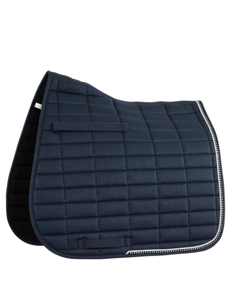 Chic, preformed saddle pad made of polyester cotton with a polyester Airflow lining. The saddle pad has a filling of 300 g polyfill and 10 mm foam. With square quilting, 10 x 5 cm. The saddle pad has been decorated with silver-coloured cord piping and piping with imitation diamonds. The girth loops and retaining staps have Velcro closure.