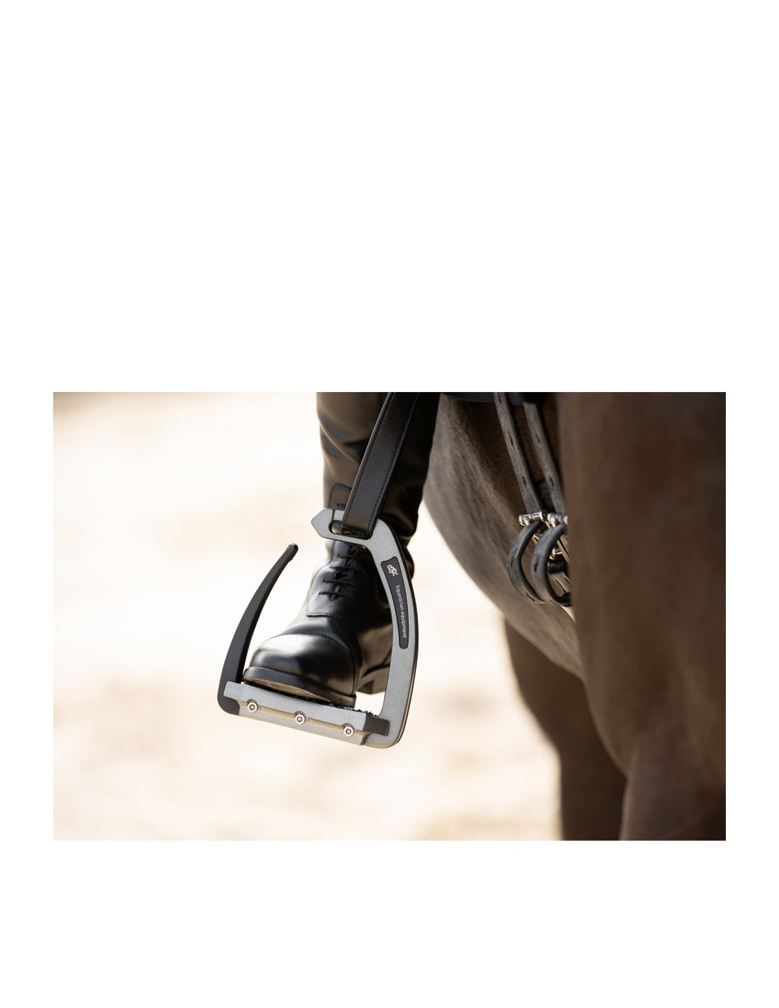 The hinged safety mechanism is made of synthetic material that flexes easily. The rider’s weight ensures that the hinge opens in the event of a fall. This prevents the foot from getting caught in the stirrup. As soon as the foot leaves the stirrup, the hinge flexes back to its original position. The footbed has an anti-slip pattern to ensure that dirt does not stick to it and to provide maximum stability to the rider. The tread is slightly angled, to keep the heel down. The bevelled opening for the stirrup leather ensures a good stirrup position, keeping the foot in the correct position. This gives the rider more stability and improves the leg position.