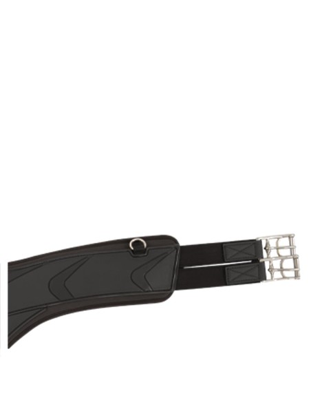 The Poly Anatomic girth with stud guard is lined with soft neoprene. The stud guard provides optimum belly protection when jumping and the anatomical design of the girth gives the horse optimal freedom of movement. The girth has elastic on both sides and elegant roller buckles. The elastic inserts offer extra comfort and make it easier to girth your horse. There are two D-rings in the middle and a small D-ring on both sides for the possible attachment of draw reins. The girth is easy to clean.