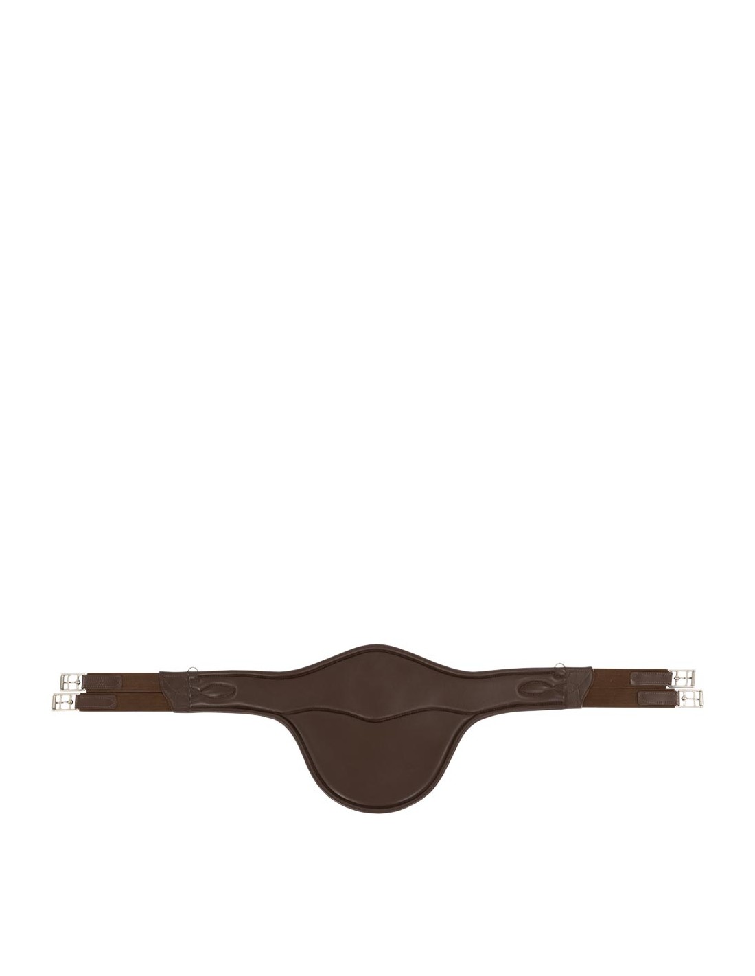 The stud guard provides optimal protection of the horse's belly while jumping and the anatomical design of the girth ensures optimal freedom of movement. The girth contains elastic inserts at both ends and elegant stainless steel roller buckles. The elastic inserts offer extra comfort and this makes it easier to girth your horse. In the middle there is a snap hook and on the sides there are two small D-rings for the attachment of auxiliary reins. The playful decorative stitching completes the belt in an elegant way.