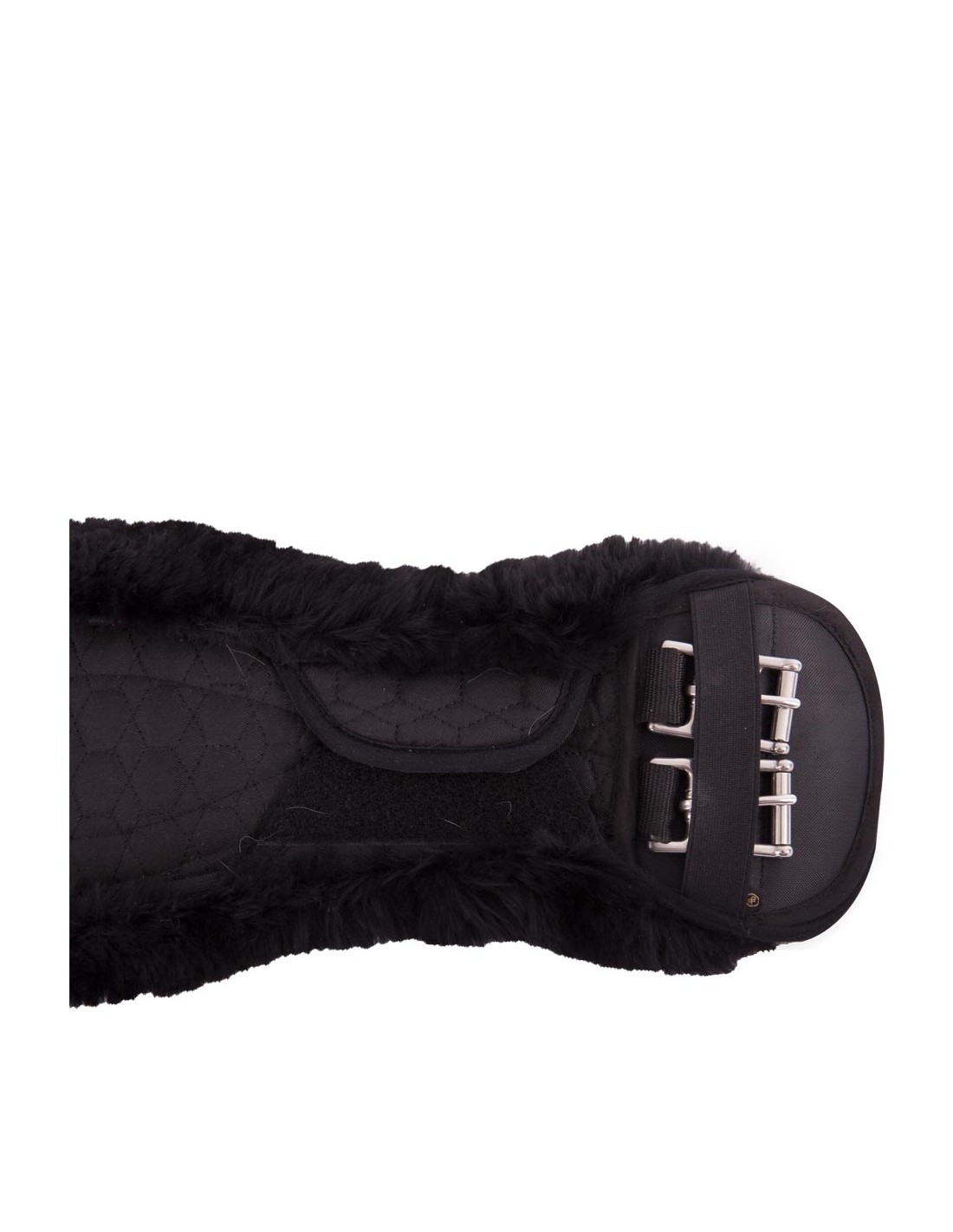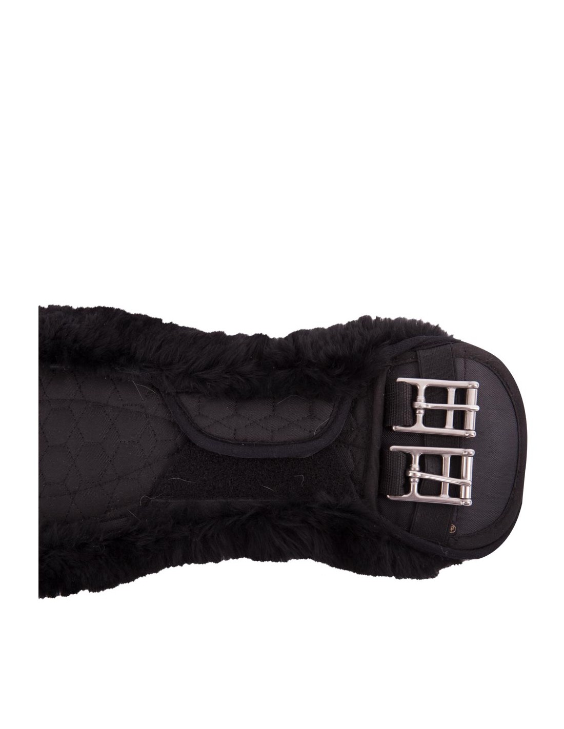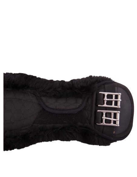 This anatomically shaped dressage girth in quilted polycotton has a soft lining made of natural sheepskin. This comfortable lining distributes and reduces the pressure of the girth and also prevents pressure sores and overheating. Medically tanned sheepskins are hygienic, sweat resistant and inhospitable to bacteria. Especially suitable for horses with sensitive skin. The lining is fully detachable using four strong Velcro fastenings and elastic straps on both sides. This allows the lining to be washed separately from the girth. The girth features stainless steel roller buckles with elastic on one side, making it easier to girth the horse. It also keeps the saddle sitting straight and correctly on the horse. The girth features two centre D-rings for attaching training aids. The anatomic shape of the girth gives the horse maximum freedom of movement.