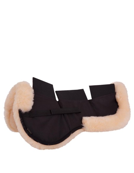 This anatomically shaped cotton half pad features a wide border of medically tanned sheepskin. The bottom of the pad is also fully lined with sheepskin and has a channel down the spine to provide additional clearance. The pad comes with six individual neoprene pads, which can be placed in the compartments on top. The 8 mm thick pads can be used to slightly raise the withers and back area. As a result, the pad allows for a stable saddle position for horses with low or mutton withers or a low or sway back. The combination of sheepskin and neoprene distributes the weight of saddle and rider very evenly across the horse's back. This reduces the risk of pressure on the spine and withers. Medically tanned sheepskins prevent excessive heat accumulation and in addition, they are hygienic, sweat resistant and antibacterial. Especially suitable for horses with sensitive skin. The pad fits under all saddles and can be used directly on the horse’s back or between saddle and saddle pad. To preserve the natural properties of the sheepskin, we recommend washing the product at 30°C using a special leather detergent.