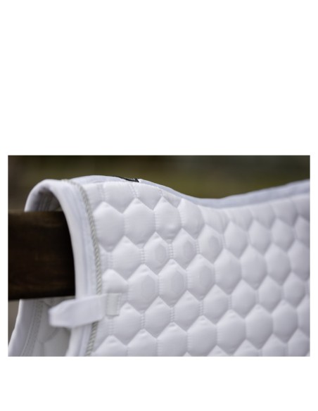 This luxurious competition saddle pad is anatomically shaped for a nice fit and contains silicone on both sides to enable the saddle to stay firmly on the pad. The breathable lining ensures optimal air circulation, keeping the horse's back cool. The thick filling of 300g polyfill and 10 mm foam ensures even pressure distribution.