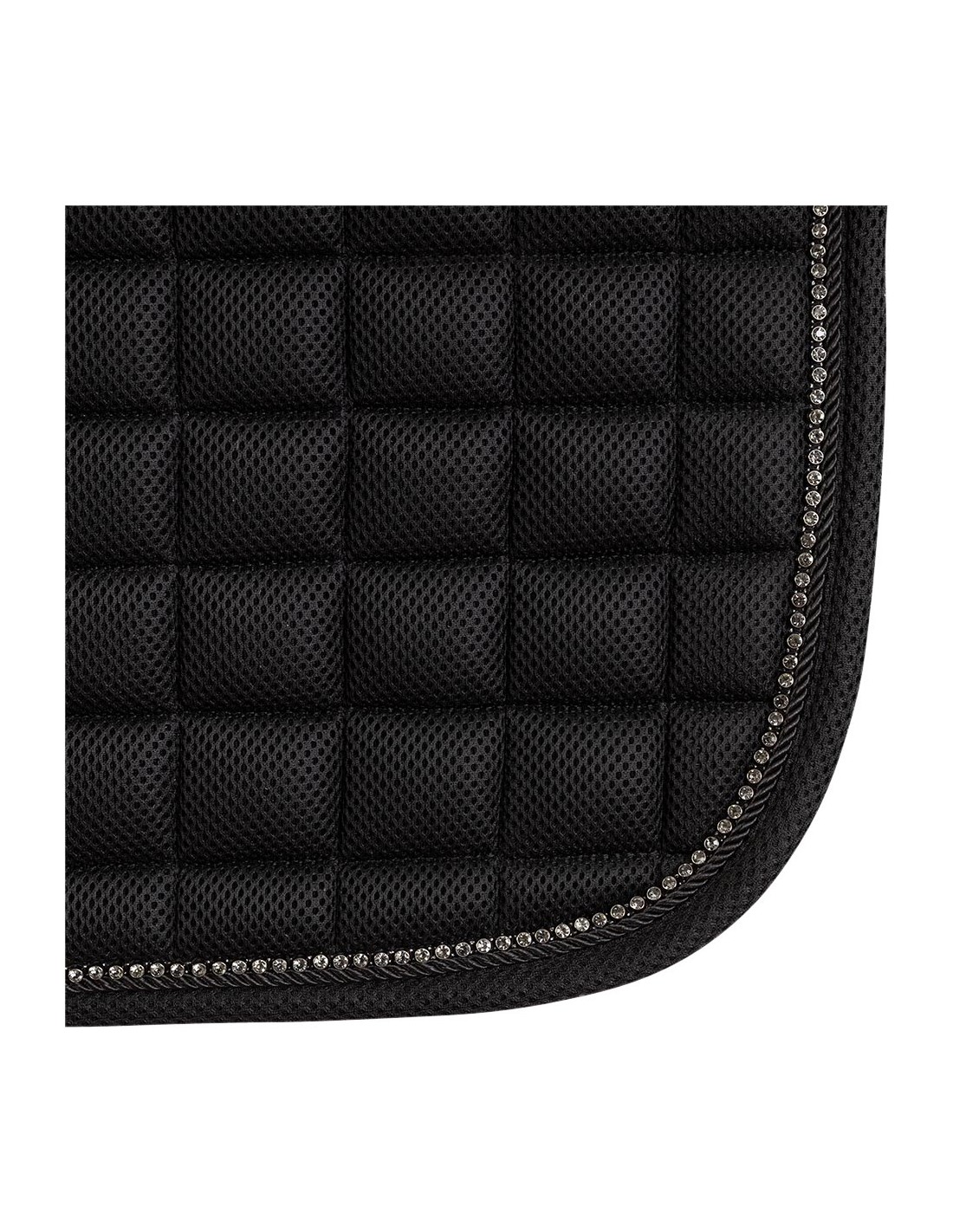 Anatomically shaped, extremely breathable, moisture-regulating and quick-drying: these are the characteristics of the Ace Flow saddle pad that offer optimal comfort to your horse. In addition, the saddle pad is partly edged with a matching cord piping and a shiny chain of stones.