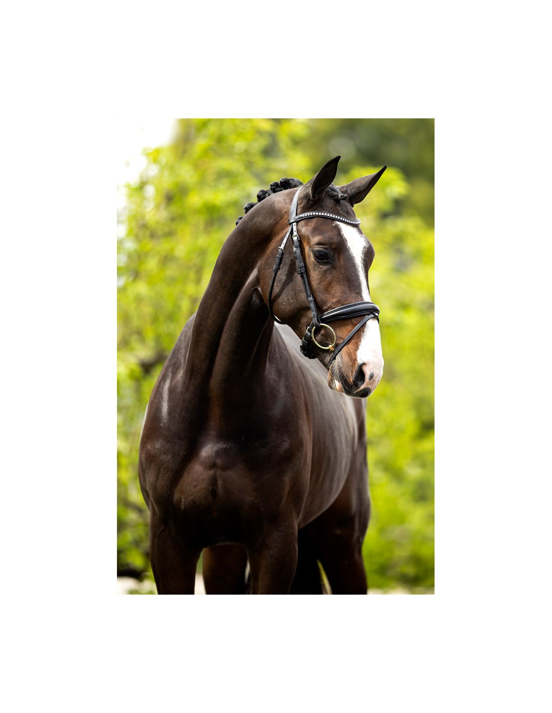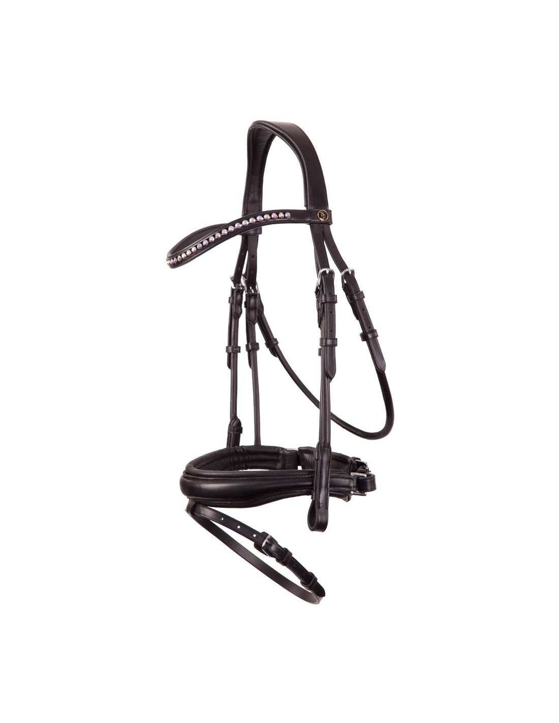 This symmetric bridle made of high-quality European leather features an E-Line headpiece. This anatomically shaped headpiece is softly padded and provides extra freedom behind the horse’s ears thanks to its round shape. The curved browband is encrusted with silver-coloured Austrian crystals and features soft leather facing. The throatlash can be adjusted on both sides. Both throatlash and cheekpieces are made of rolled leather. The cheekpieces are fitted with hook stud billets. The bridle has a wide, crank flash noseband (approx. 4 cm) with straps made of rolled leather. The noseband is round raised, softly padded and equipped with a wide chin pad. The anatomic shape of the noseband provides more space for the bit rings. The bridle has a V-shaped flash attachment and the buckle of the flash strap features an extra protection flap. The bridle features shiny, silver-coloured fittings made of chrome-plated brass. Supplied without reins.