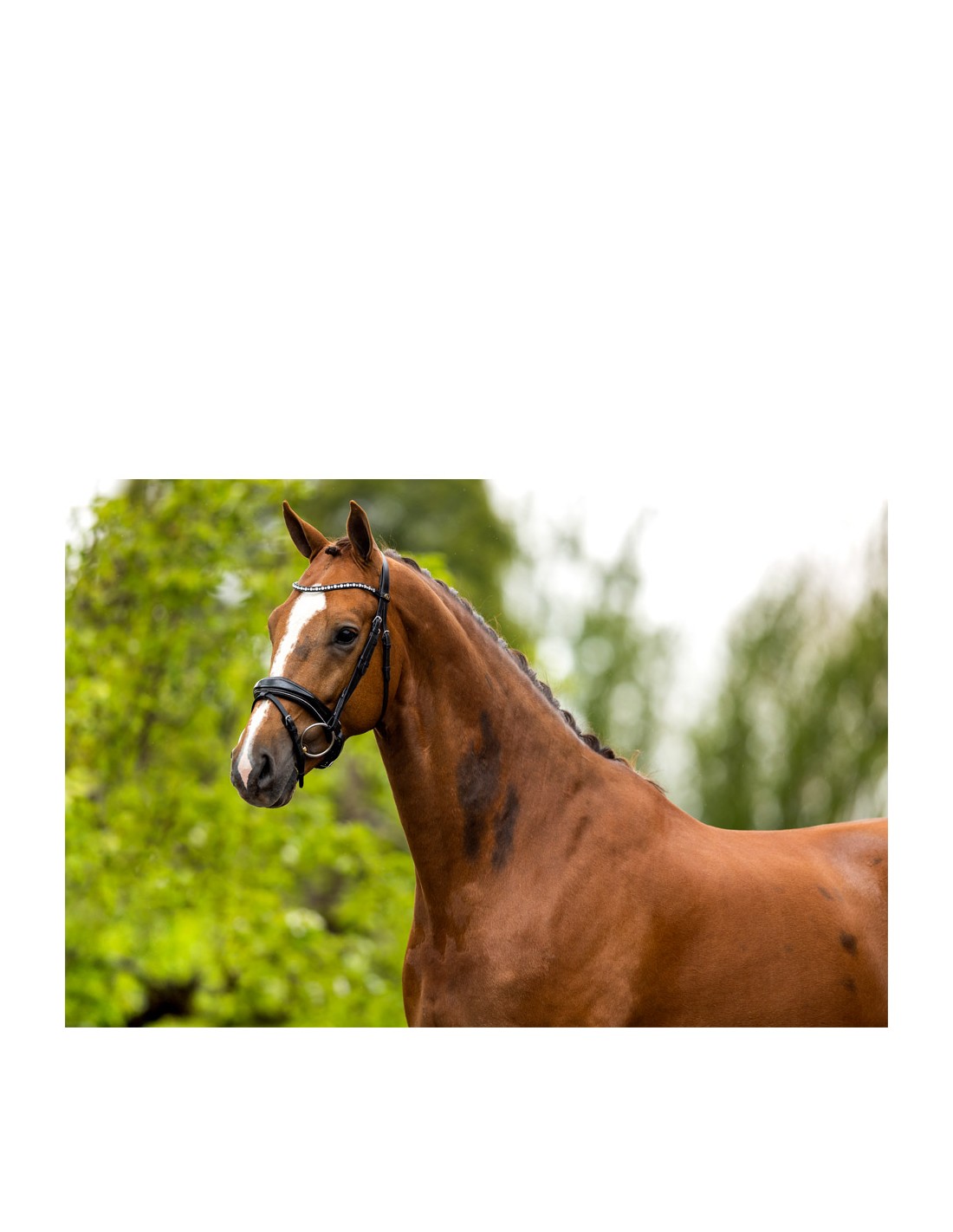 This symmetric bridle made of high-quality European leather features an E-Line headpiece. This anatomically shaped headpiece is softly padded and provides extra freedom behind the horse’s ears thanks to its round shape. The narrow, curved browband is encrusted with silver-coloured Stellux™ crystals in two different sizes. The throatlash can be adjusted on both sides. The cheekpieces are fitted with hook stud billets. The bridle has a wide, crank flash noseband (approx. 4 cm) with patent leather. The anatomically shaped noseband is round raised, softly padded and equipped with a wide chin pad. In addition, the noseband is subtly embellished with small imitation diamonds. The bridle has a V-shaped flash attachment and the buckle of the flash strap features an extra protection flap. The bridle features shiny, silver-coloured fittings made of chrome-plated brass. Supplied without reins.