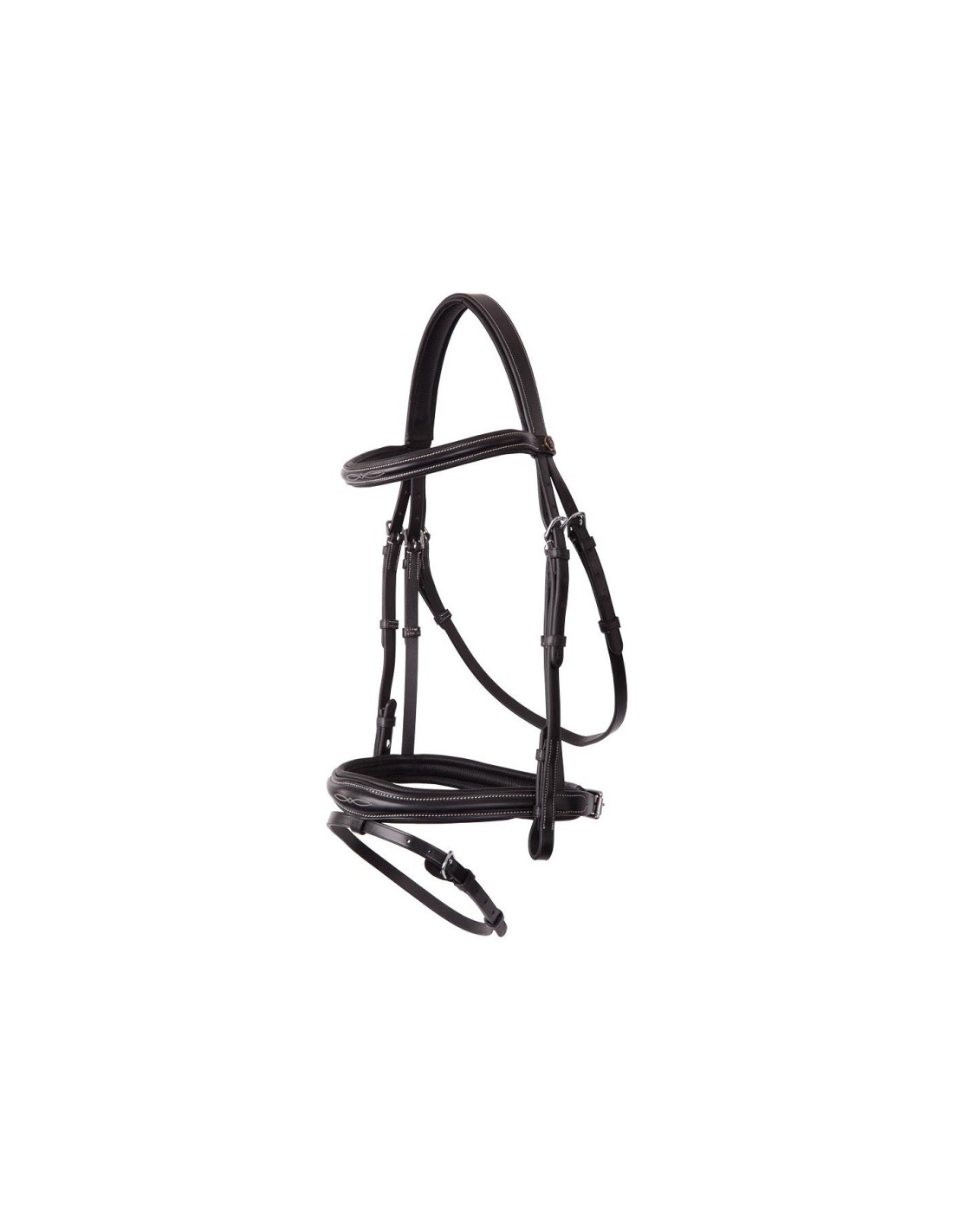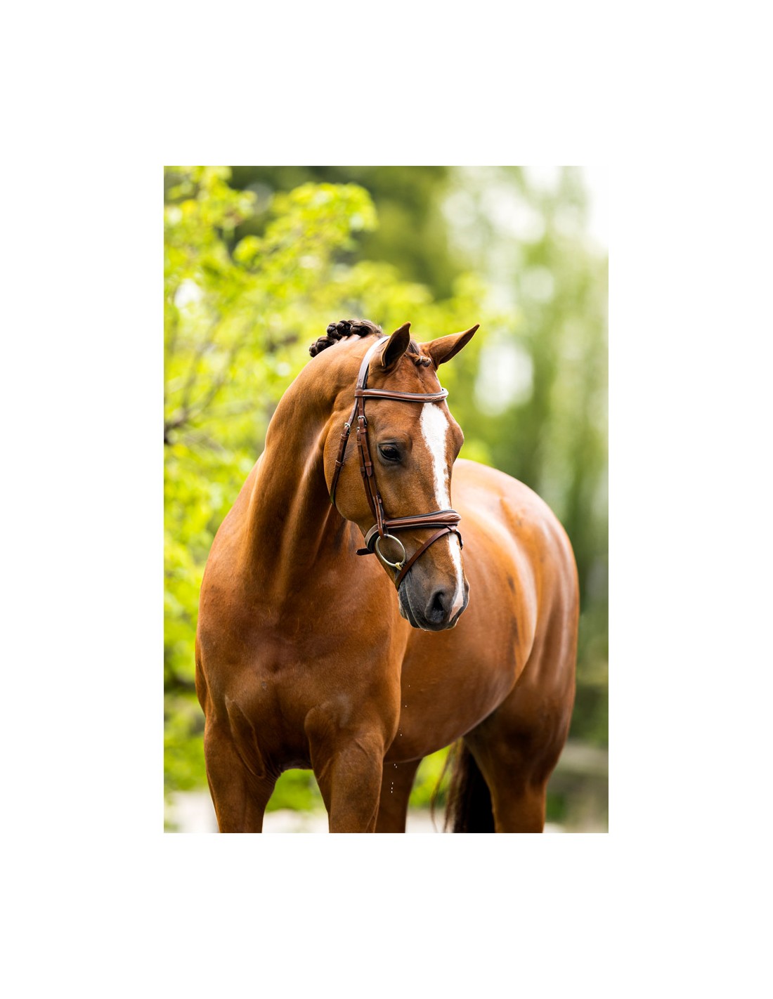 This symmetric bridle made of high-quality European leather features a headpiece with soft padding. The straight browband is round raised, softly padded and embellished with cream-coloured stitching. The throatlash can be adjusted on both sides. The cheekpieces are fitted with hook stud billets. The bridle has a flash noseband (approx. 3 cm) with cream-coloured stitching. This slightly shaped noseband is round raised and softly padded. The bridle has a V-shaped flash attachment and the buckle of the flash strap features an extra protection flap. The bridle features shiny, silver-coloured fittings made of chrome-plated brass. Supplied without reins.