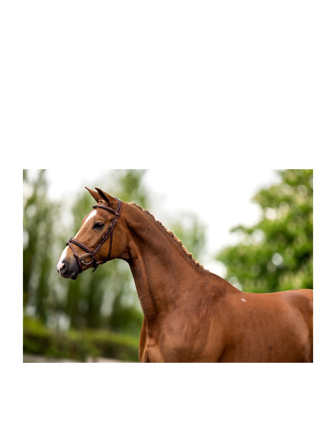 This symmetric bridle made of high-quality European leather features an E-Line headpiece. This anatomically shaped headpiece is softly padded and provides extra freedom behind the horse’s ears thanks to its round shape. The straight browband is round raised, softly padded and finished with contrast stitching. The throatlash is adjustable with a buckle at the bottom. The buckle features an extra protection flap. The cheekpieces are fitted with hook stud billets. The bridle has a flash noseband (approx. 2.7 cm) embellished with contrast stitching. The noseband is round raised and softly padded. Both flash strap and attachment are detachable. As a result, the bridle can be easily adapted to a model with a single noseband. The buckle of the flash strap features an extra protection flap. The bridle features shiny, silver-coloured fittings made of chrome-plated brass. Supplied without reins.