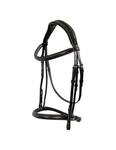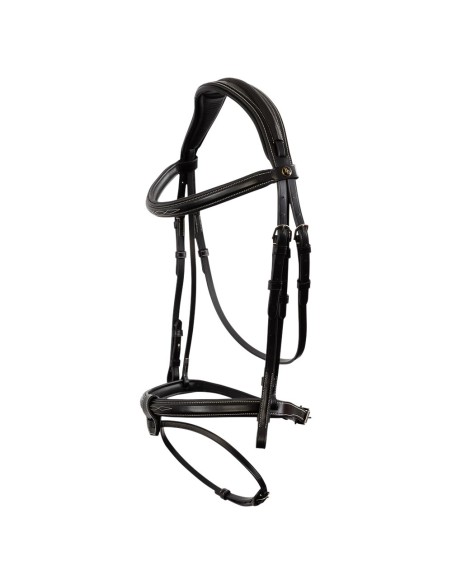 The bridle is made of high-quality leather that will last a long time. Both the noseband and the straight browband are squarely raised and embellished with decorative stitching. The 20 mm wide noseband is equipped with a buckle protector for optimal comfort. The 15 mm wide flash strap is removable via the slideable loop that can be slided off the noseband. The flash strap also contains a buckle protector.