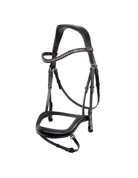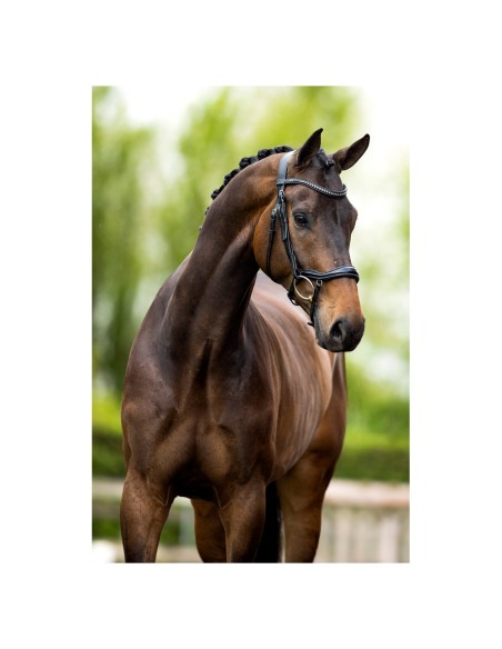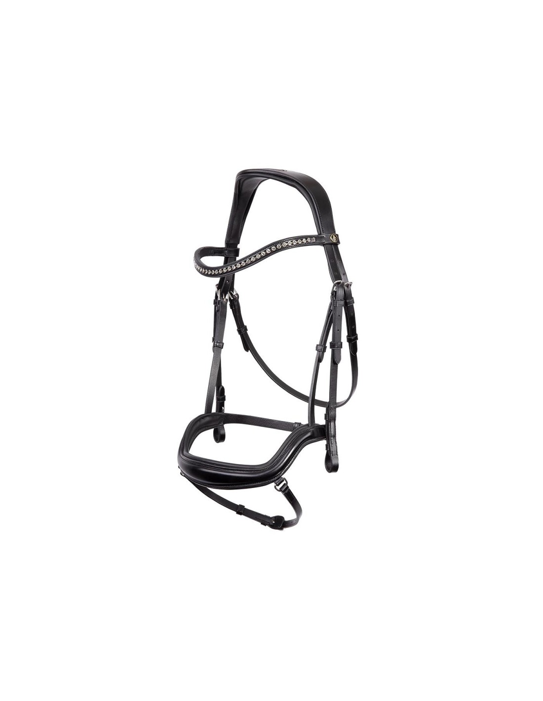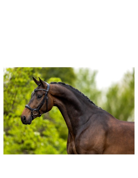 The bridle is made of flexible, soft leather, which ensures a good fit. The leather is high-quality and durable. The slightly curved BR Browband Vosges is embellished with a chain of luxurious Stellux™ crystals in colour Black Diamond and is leather faced. The crystals are fit extra tightly and secure into the chain. The bridle features shiny, silver-coloured, chrome-plated brass hardware.