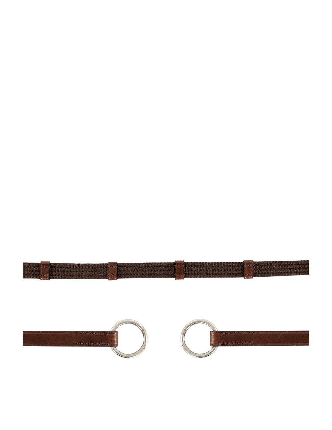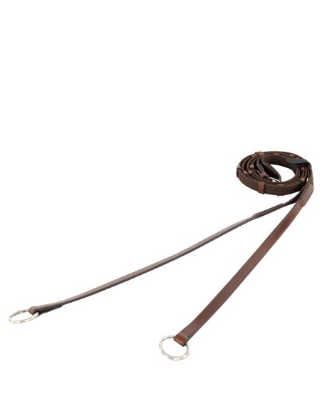 This BR web rein is 19mm wide and features 7 leather stops that are placed close together for a good grip. There are strong rings at the ends with a diameter of 30 mm. The reins are finished with top quality Polo leather that lasts for a long time