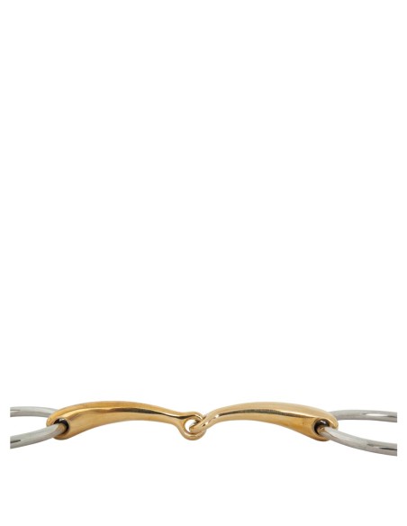 This high-quality single jointed loose ring snaffle is made of solid Cuprigan with stainless steel rings. Cuprigan is an alloy consisting of 89% copper, 7% aluminium, 3% iron and 1% zinc. The oxidation process of the material gives a pleasant smell and taste. The anatomical design of the bit follows the shape of the horse’s mouth, which allows for a gentle and even pressure distribution. The design, combined with the unique properties of Cuprigan, encourages the chewing process and saliva production, which allows for a pleasant connection with the sensitive horse’s mouth. The bit applies mild pressure on the mouth. Mouthpiece thickness 12 mm, ring size 70 mm.