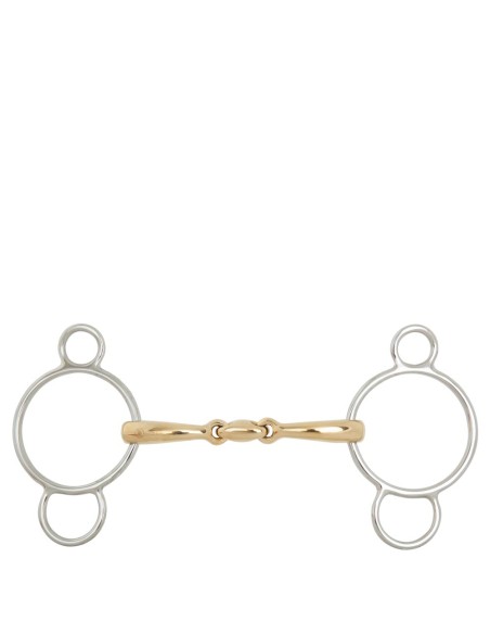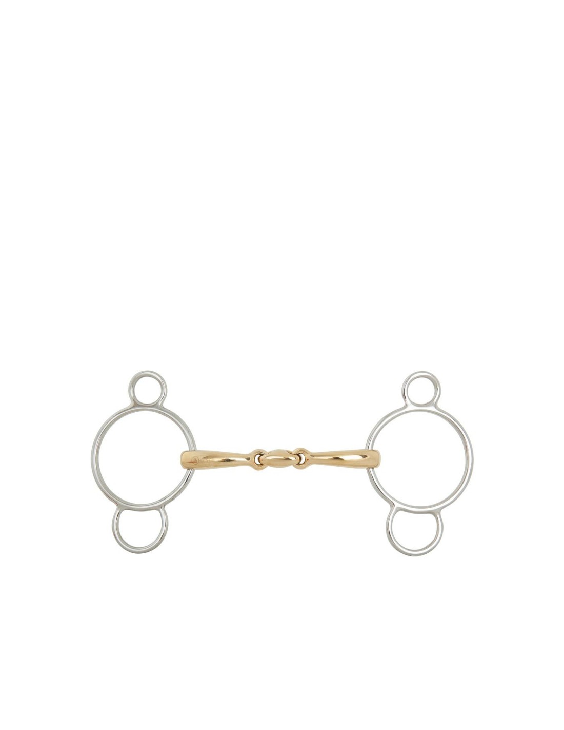 This high-quality double jointed three ring gag is made of solid Cuprigan with stainless steel rings. Cuprigan is an alloy consisting of 89% copper, 7% aluminium, 3% iron and 1% zinc. The oxidation process of the material gives a pleasant smell and taste. The anatomical design of the bit follows the shape of the horse’s mouth, which allows for a gentle and even pressure distribution. The design, combined with the unique properties of Cuprigan, encourages the chewing process and saliva production, which allows for a pleasant connection with the sensitive horse’s mouth. The bit applies normal pressure on the mouth and is suitable for hardmouthed horses. Mouthpiece thickness 16 mm, centre ring size 70 mm.