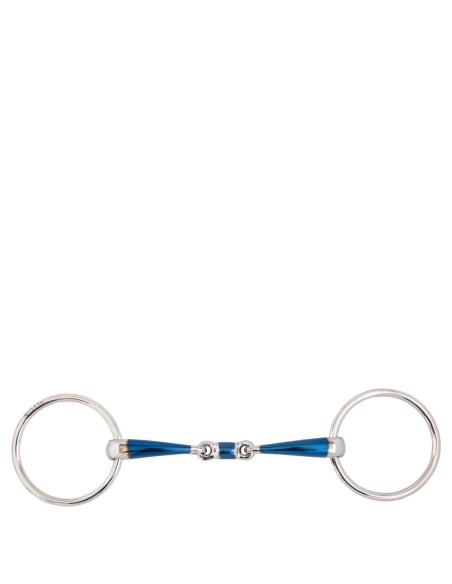 This double jointed loose ring snaffle is made of solid stainless steel rings and a mouthpiece of mild steel combined with a layer of sweet iron on the mouthpiece (blue). The sweet iron stimulates the chewing process and saliva formation. When this material reacts with moisture, warmth and air in a process called oxidation, the surface rust tastes sweet. As a result, the horse will be more willing to accept the bit. The blue colour disappears eventually, but the taste of the surface rust remains.
