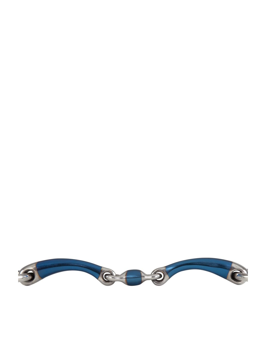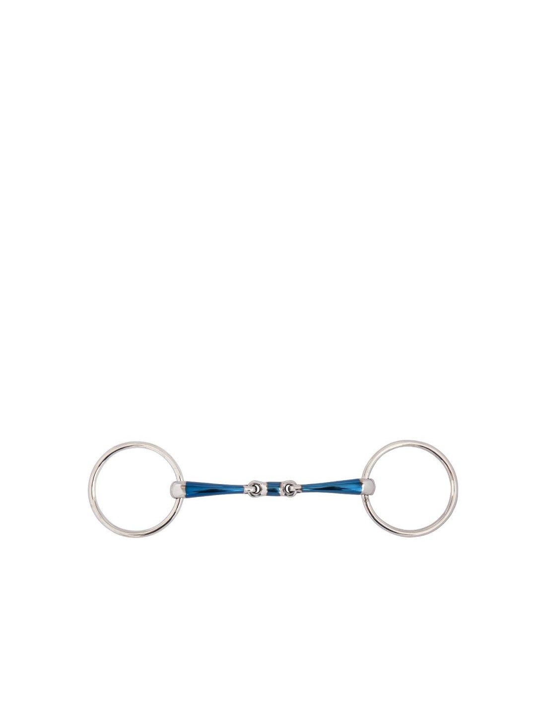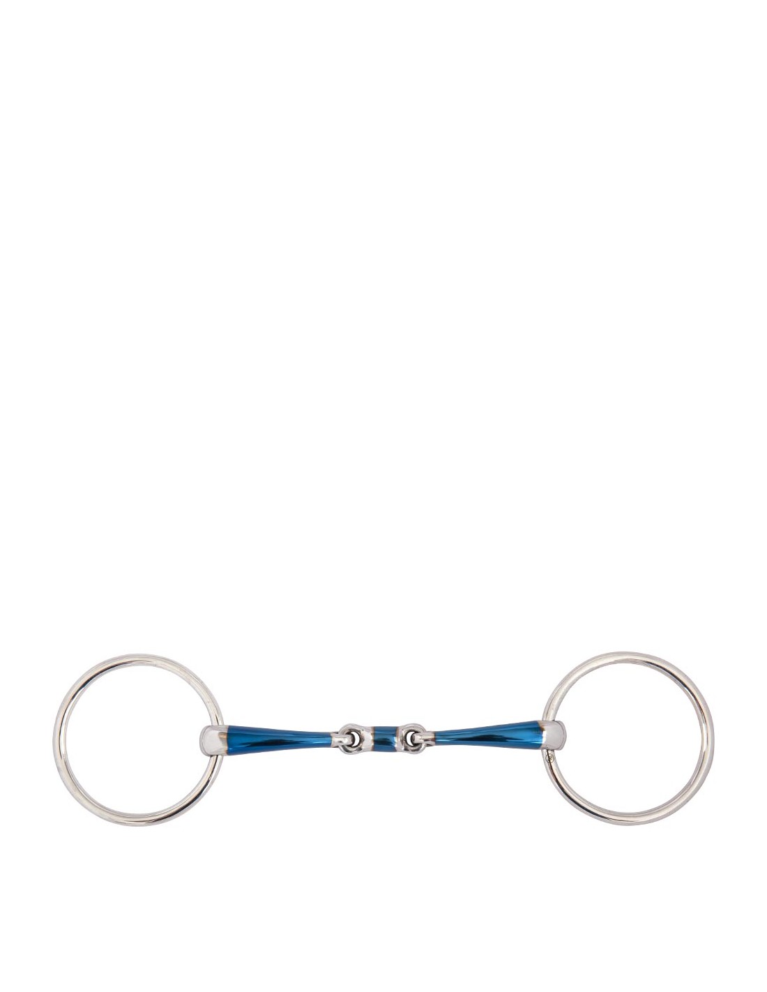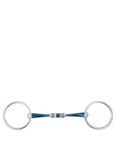 This double jointed loose ring snaffle is made of solid stainless steel rings and a mouthpiece of mild steel combined with a layer of sweet iron on the mouthpiece (blue). The sweet iron stimulates the chewing process and saliva formation. When this material reacts with moisture, warmth and air in a process called oxidation, the surface rust tastes sweet. As a result, the horse will be more willing to accept the bit. The blue colour disappears eventually, but the taste of the surface rust remains.