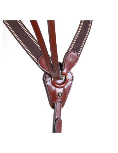 Leather breastplate with elastic in the neck strap and a leather martingale attachment. The breastplate has many adjustment possibilities and can easily be attached to the saddle with snap hooks, the martingale attachment is also easy detachable with a snap hook. The breastplate is made of the best full-grain European leather. This kind of leather is strong, supple, feels soft and is durable. Most parts have a soft leather facing and the breastplate is beautifully finished, with high-quality stainless steel buckles. The breastplate prevents the saddle from sliding backward, especially by jumping. This is also a problem with very round horses and a breastplate can be useful. The martingale which can be attached, prevents the horse from throwing its head.