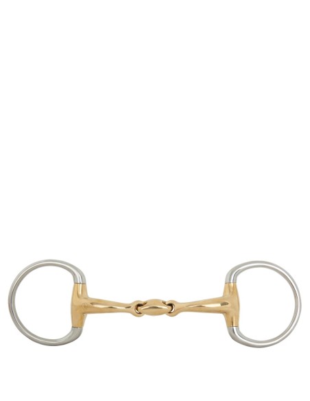This high-quality double jointed eggbutt snaffle is made of solid Cuprigan with stainless steel rings. Cuprigan is an alloy consisting of 89% copper, 7% aluminium, 3% iron and 1% zinc. The oxidation process of the material gives a pleasant smell and taste. The anatomical design of the bit follows the shape of the horse’s mouth, which allows for a gentle and even pressure distribution. The design, combined with the unique properties of Cuprigan, encourages the chewing process and saliva production, which allows for a pleasant connection with the sensitive horse’s mouth. The bit applies mild pressure on the mouth. Mouthpiece thickness 16 mm, ring size 55 mm.