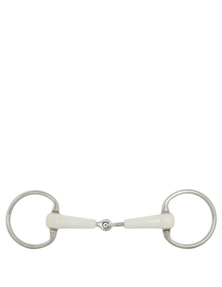 This high-quality single jointed eggbutt snaffle features a synthetic mouthpiece with a metal core and stainless steel rings. Thanks to the combination of flexible synthetic material and high-qualilty stainless steel, the bits are solid, yet very mild and gentle. The synthetic material features a 90A hardness and is FDA approved. This means the material is non-toxic and free of solvents and plasticizers. The bits can be used for all horses and are particularly suitable for young horses; horses with sensitive mouths and horses that are having difficulty accepting other materials. The bit applies very mild pressure on the mouth. Mouthpiece thickness 18 mm, ring size 70 x 45 mm.