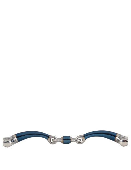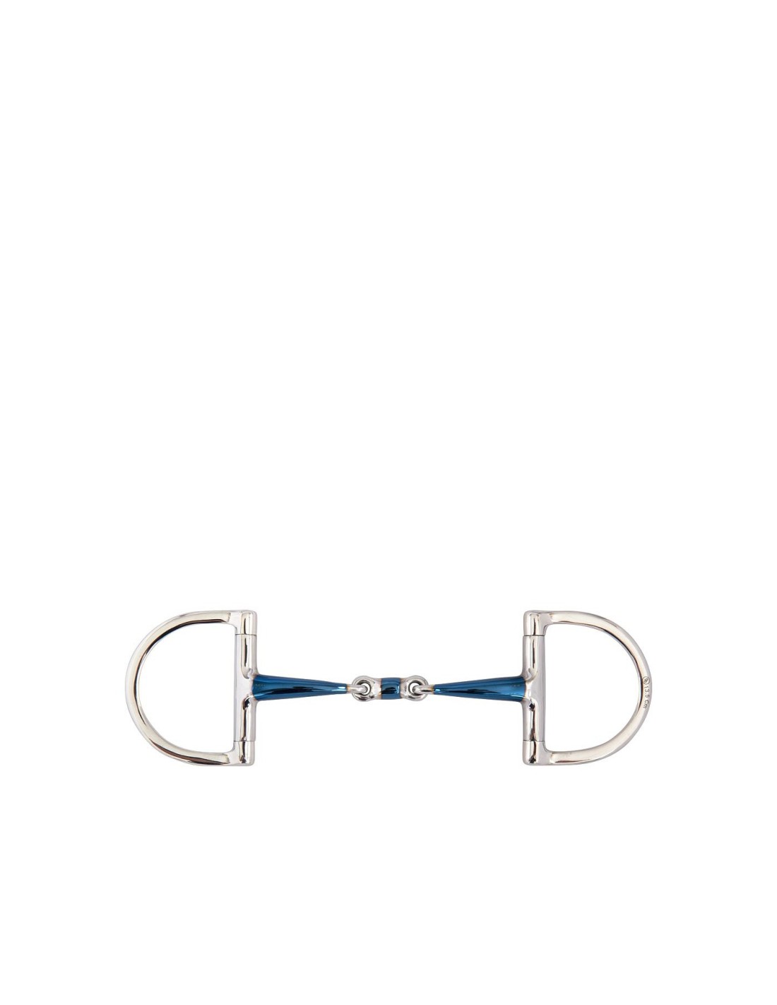 This double jointed Dee-Ring bit is made of solid stainless steel rings and a mouthpiece of mild steel combined with a layer of sweet iron on the mouthpiece (blue). The sweet iron stimulates the chewing process and saliva formation. When this material reacts with moisture, warmth and air in a process called oxidation, the surface rust tastes sweet. As a result, the horse will be more willing to accept the bit. The blue colour disappears eventually, but the taste of the surface rust remains.