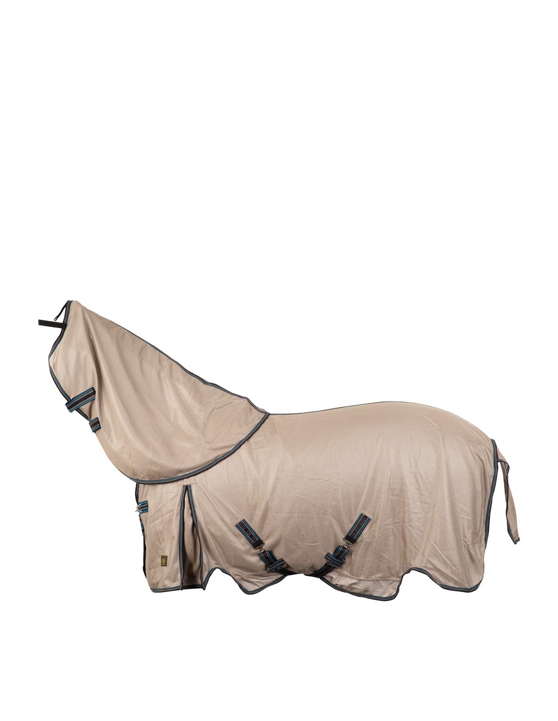 This fly rug is made of a supple polyester mesh fabric. This fine-mesh material provides excellent protection against flies and other insects. The chest is reinforced with an additional layer of polyester mesh and the mane area is lined with smooth 190T nylon. The rug features a detachable neck cover with two Velcro closures at the front and three elastic straps at the top to attach a halter. The neck cover attaches easily to the D-rings of the rug by means of three elastic straps with quick release clips and Velcro. The surcingles are reinforced in the form of the synthetic leather Pu patch. The rug is equipped with a single adjustable front strap with quick release clip and large Velcro closure. In addition, the rug has a binding on the back and a fleece wither protector. It further benefits from shoulder gussets; cross surcingles with elastic insert straps that are both adjustable and detachable and adjustable, detachable, elastic leg straps. Its extra shaped bottom line provides optimum belly protection. The inner of the large tail flap features an elastic strap to secure the tail in place and in addition, the rug has a tail cord. The rug features zinc hardware with a matt silver-coloured finish. Machine washable at 30°C.